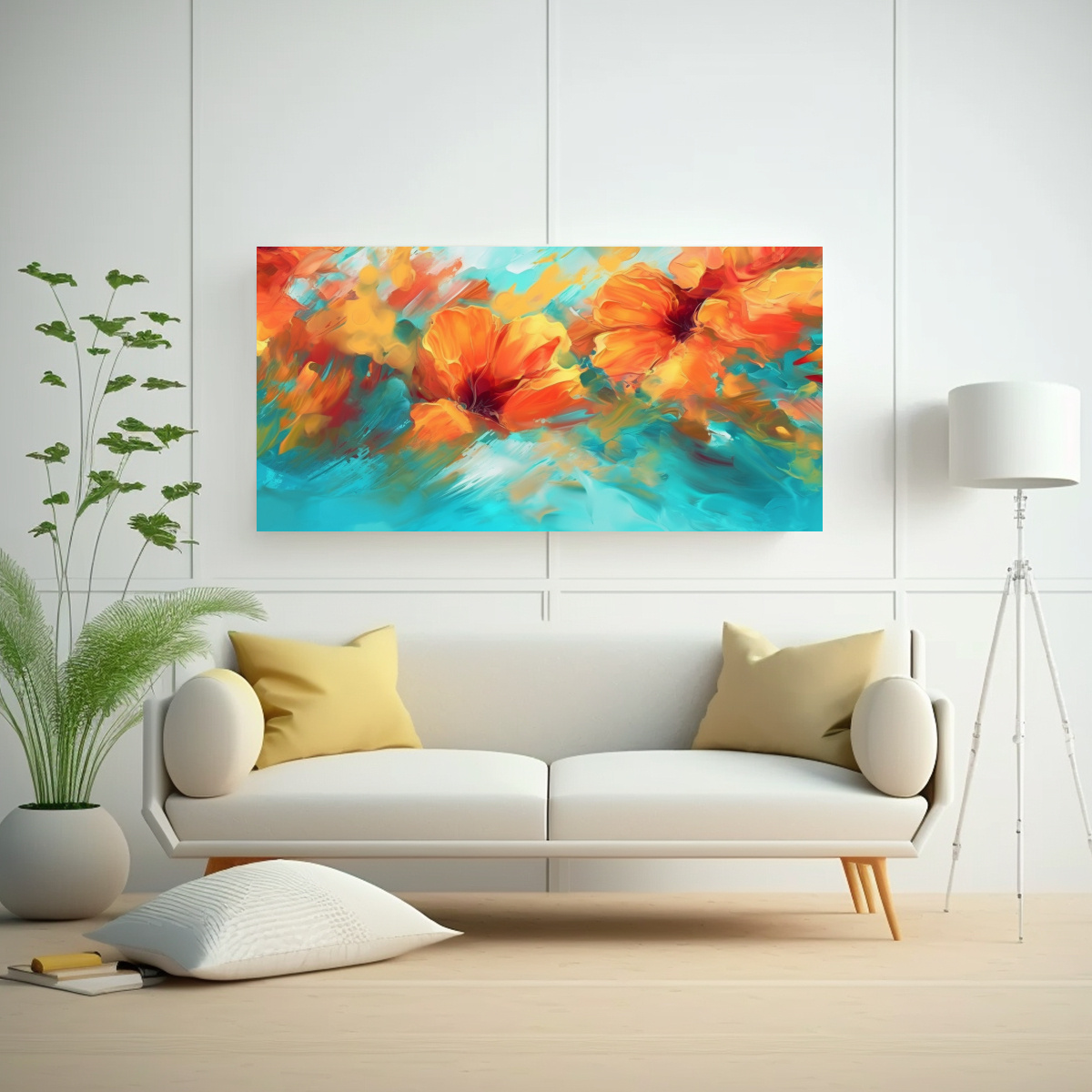 Este Cuadro Abstracto en Coral, Turquesa y Amarillo es perfecto para dar vida a tu sala de estar Colócalo sobre un sofá gris para resaltar los tonos cálidos y crear un ambiente moderno y acogedor