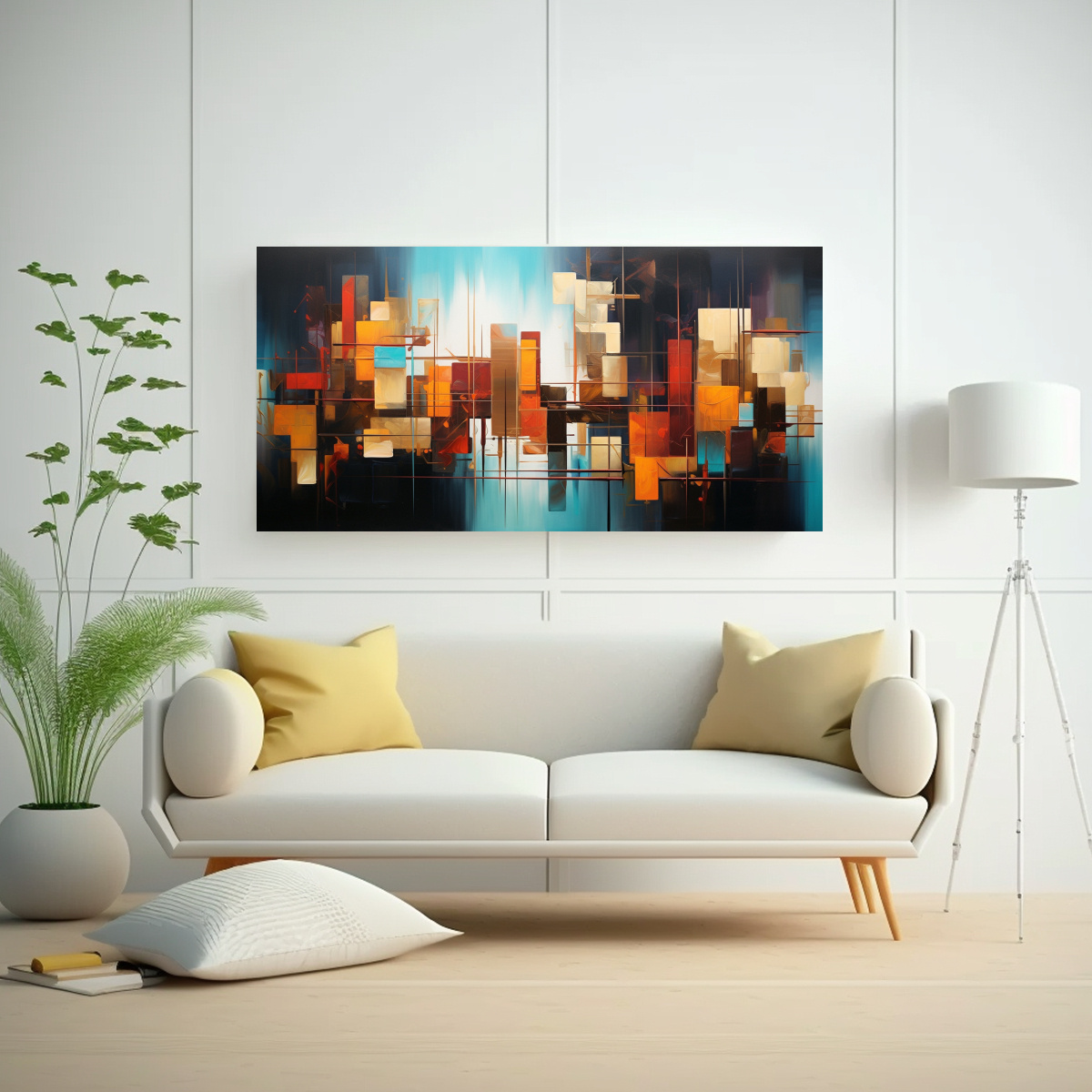 Este cuadro abstracto moderno en lienzo sublimado cultural sería perfecto para decorar una sala de estar con una paleta de colores frescos y vibrantes Colócalo sobre un sofá blanco o una pared de color claro para resaltar su belleza También puedes combinarlo con cojines y accesorios en tonos turquesa, coral y verde azulado para crear un ambiente armonioso y elegante