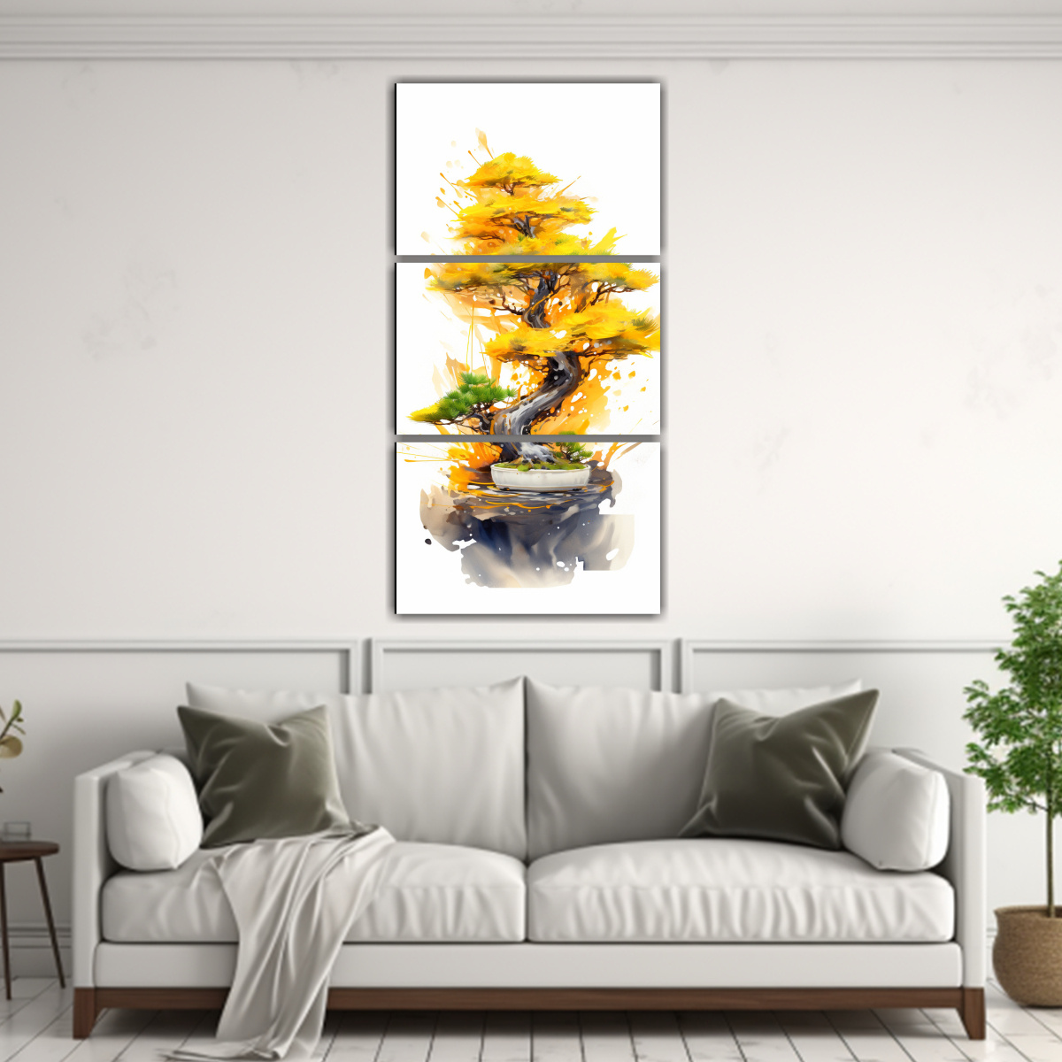 Este cuadro abstracto con árbol de bonsái en tonos amarillos sería ideal para colocar en la sala de estar sobre un sofá de color neutro, creando un contraste elegante y llamativo que realza la decoración de tu hogar