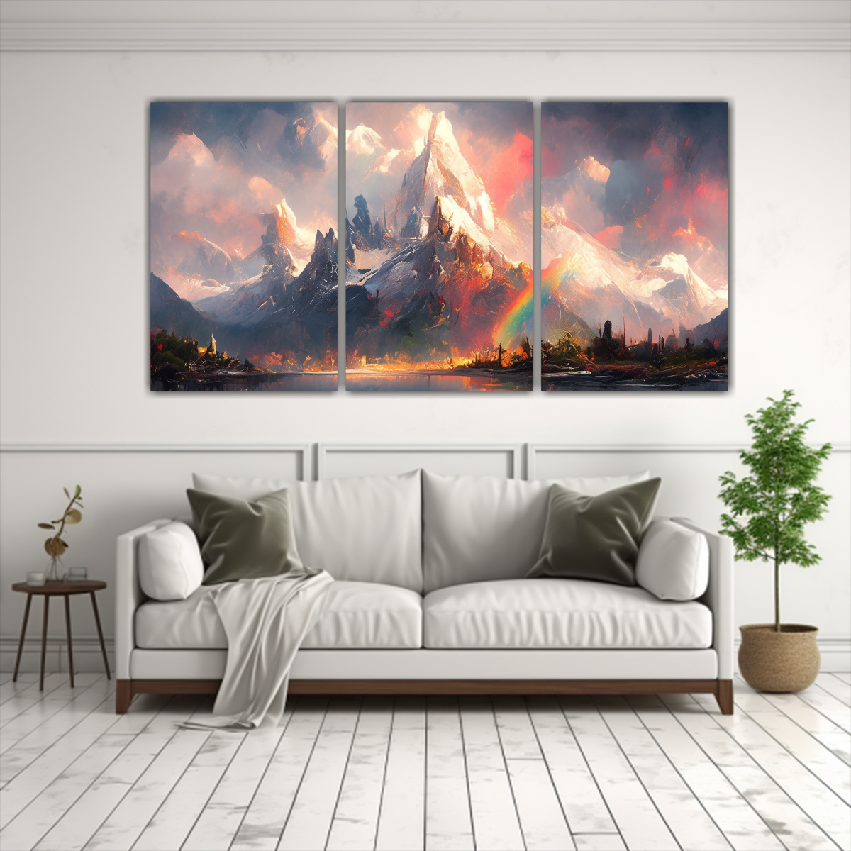 Transforma tu hogar con la belleza de las montañas nevadas y arcoíris en tonos rojos Este cuadro es perfecto para añadir un toque de color y serenidad a tu sala de estar, dormitorio o incluso tu oficina La combinación de colores suaves y vibrantes crea un ambiente acogedor y relajante