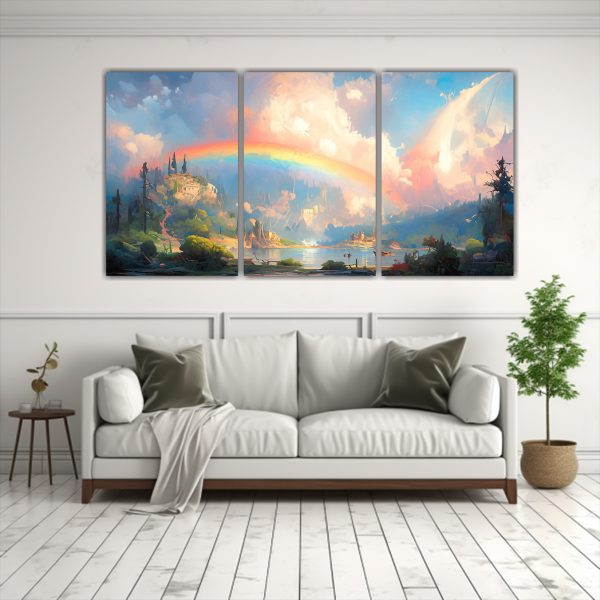 Este Cuadro Abstracto Paisaje con Arcoíris y Turquesa es ideal para colocar en la sala de estar sobre un mueble blanco para resaltar sus tonos y crear un ambiente fresco y vibrante Combinará perfectamente con plantas verdes para una decoración natural