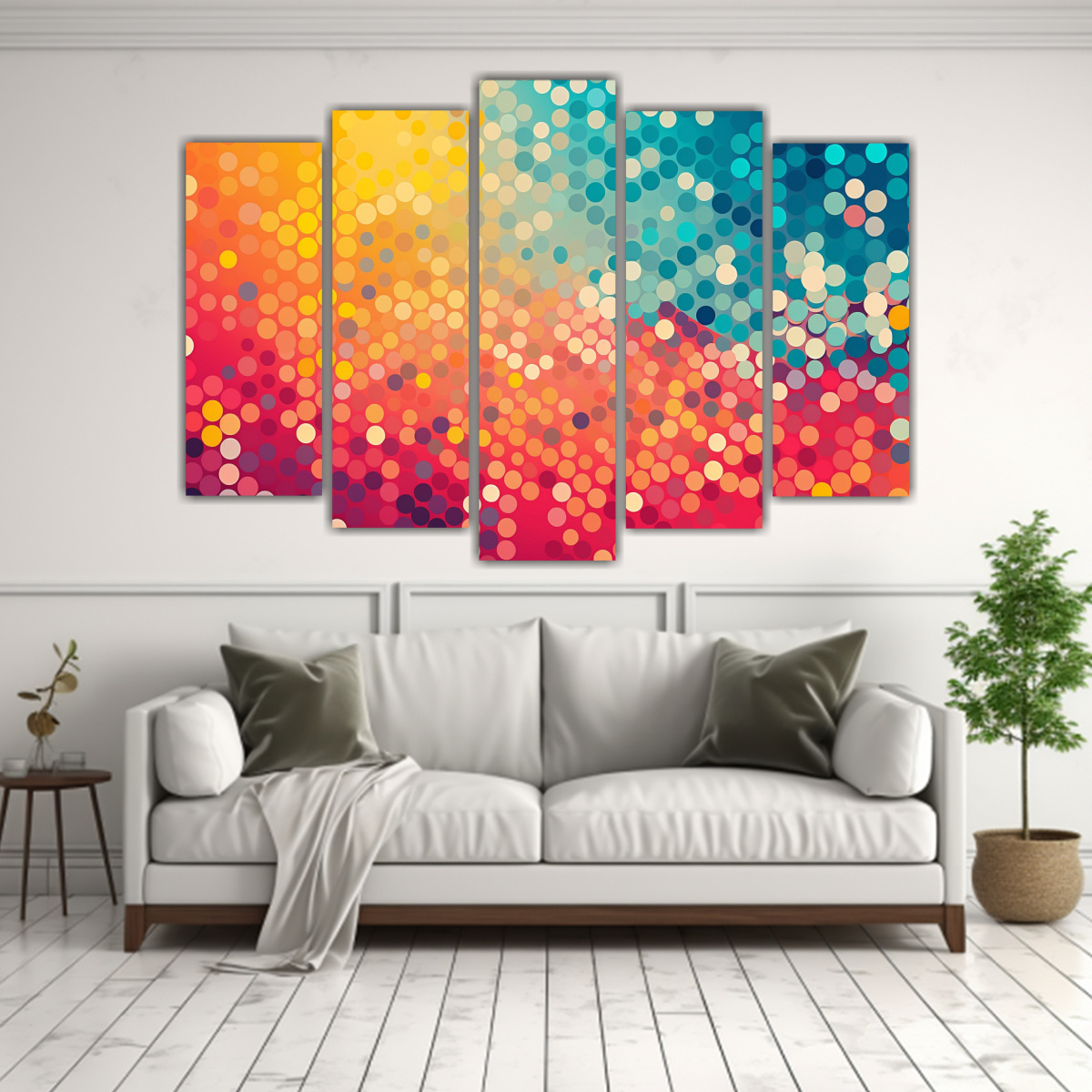 Decora tu espacio con este moderno y resistente set de 5 cuadros abstractos de puntos y semitonos Dale un toque de elegancia con la combinación de colores vibrantes como el verde azulado, coral y amarillo claro Aprovecha la mejor calidad y precios asequibles en DecoCuadros Envío gratuito en Santiago y envíos exprés a regiones