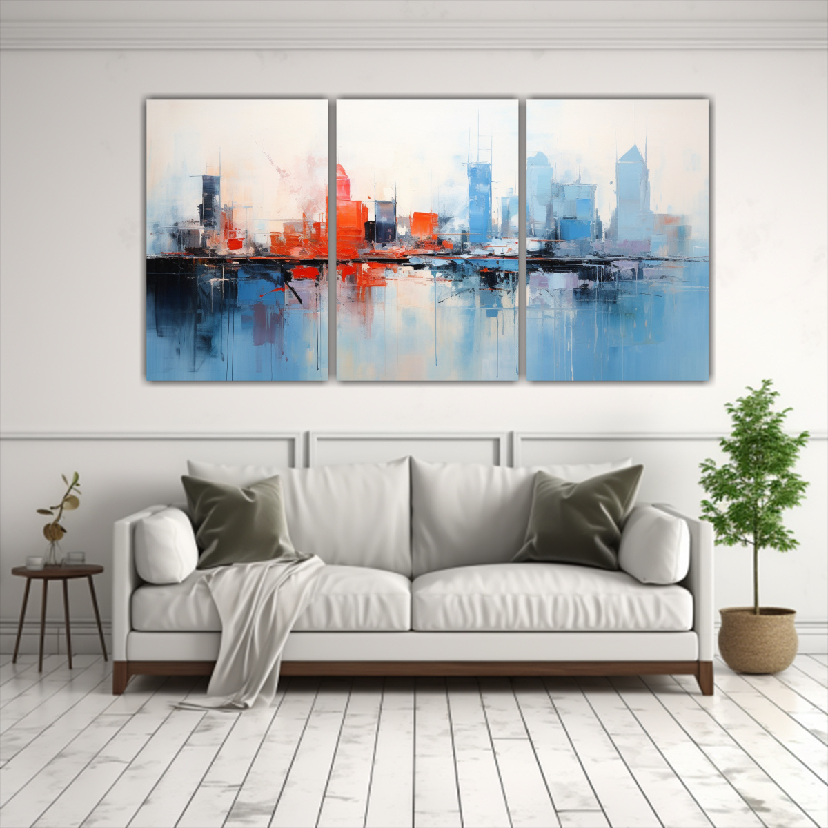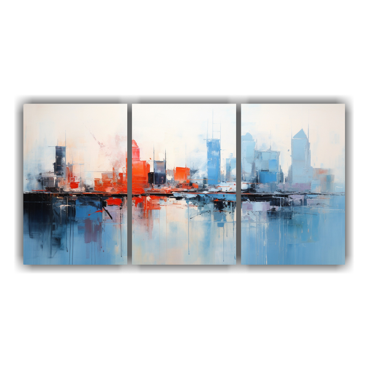 DecoCuadros ofrece cuadros abstractos vanguardia interiores de ciudad azul monocromática en tela de alta calidad con bastidores de madera Colores: Beige, Azul Marino grisaceo, Turquesa, Carmesí, Plateado, Gris, Coral, Lila
