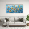 Este cuadro de girasoles azules encajará perfectamente en una sala de estar o dormitorio con una decoración moderna y sofisticada Colócalo sobre un sofá o cama de tonos neutros para crear un contraste llamativo También puedes combinarlo con elementos decorativos en los mismos tonos de la obra, como cojines o cortinas ¡Deja que los girasoles azules brinden armonía y alegría a tu hogar!