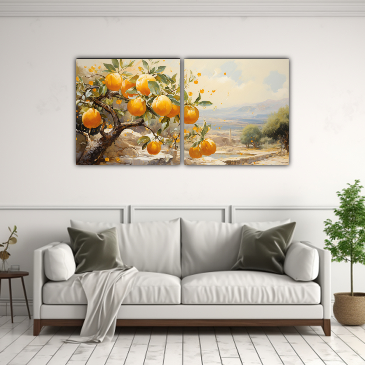 Este cuadro de Árbol naranjo blanco y dorado, pintura abstracta, es perfecto como pieza central en una sala de estar moderna Sus colores suaves y elegantes combinan muy bien con sofás en tonos neutros y muebles en madera oscura Además, su estilo minimalista aporta un toque de sofisticación y tranquilidad a cualquier ambiente