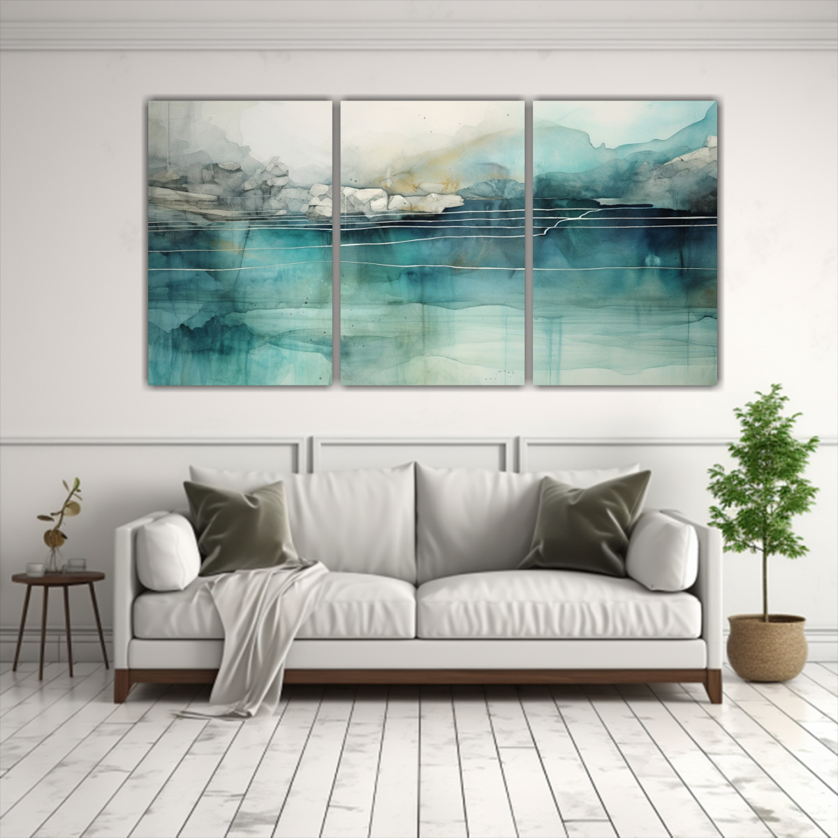 Cuadros Acuarela Para Sala En Turquesa, Verde Azulado Y Plateado