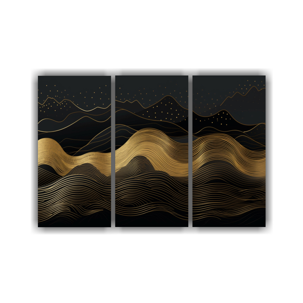 Este cuadro de montaña simétrica con fondo de oro de lujo sería perfecto para colocar en el salón principal de tu casa, sobre un sofá de color neutro para resaltar su elegancia y sofisticación Complementa la decoración con cojines en tonos dorados y grises para lograr un ambiente armonioso y lujoso
