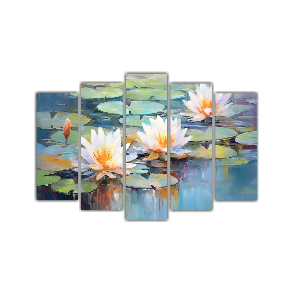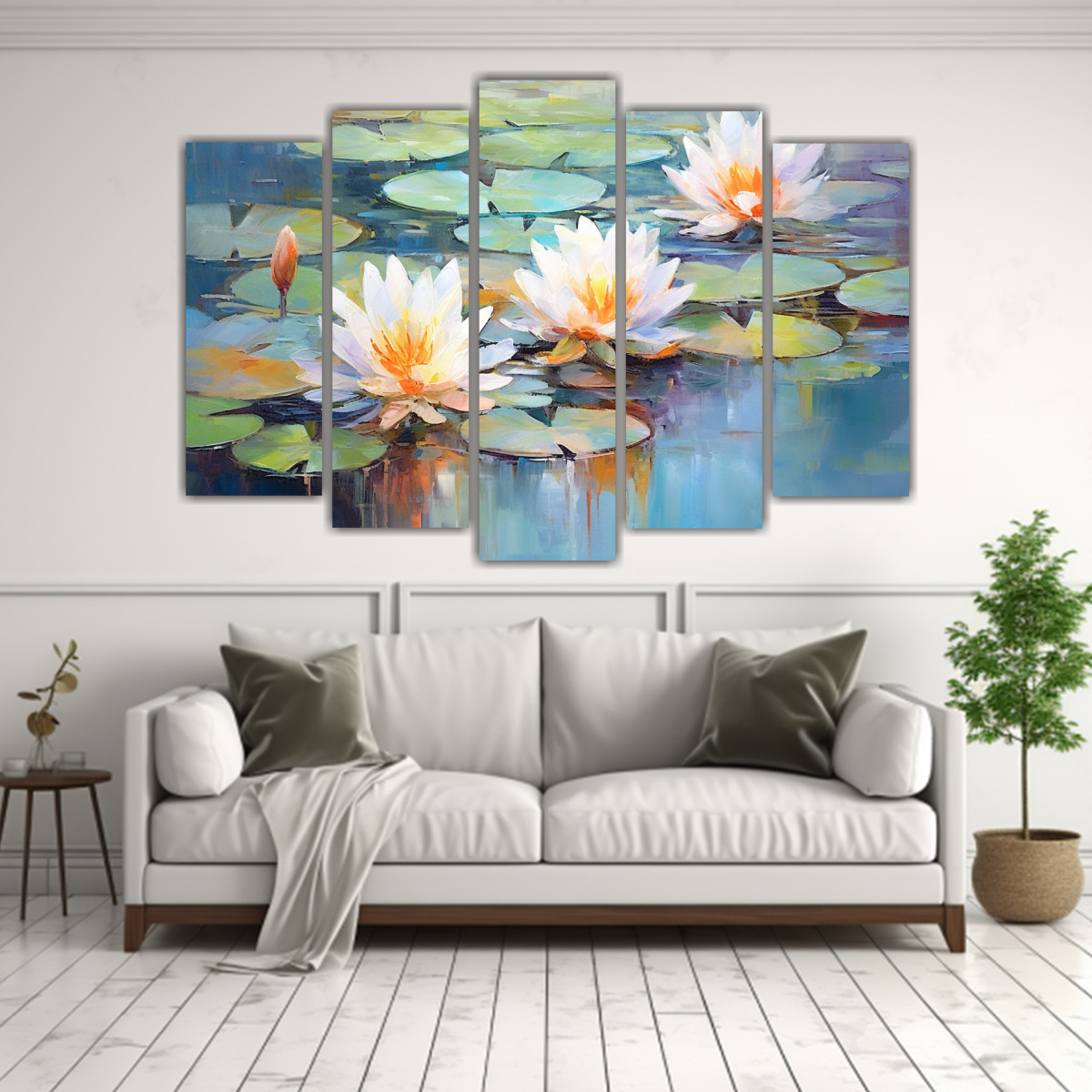 Renueva tu espacio con este cuadro de lirios de agua, ideal para traer armonía y frescura a tu hogar u oficina Los tonos azules, grises y plateados brindarán elegancia y tranquilidad a tu ambiente Combina con muebles en tonos neutros para resaltar su belleza