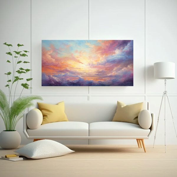 Añade un toque de elegancia a tu hogar con el cuadro inspirador de Belleza en los cielos al amanecer y atardecer Sus tonos Azul Marino grisaceo, Lila y Coral se combinan a la perfección para crear un ambiente sereno y sofisticado Colócalo en el dormitorio o la sala de estar para disfrutar de su belleza única