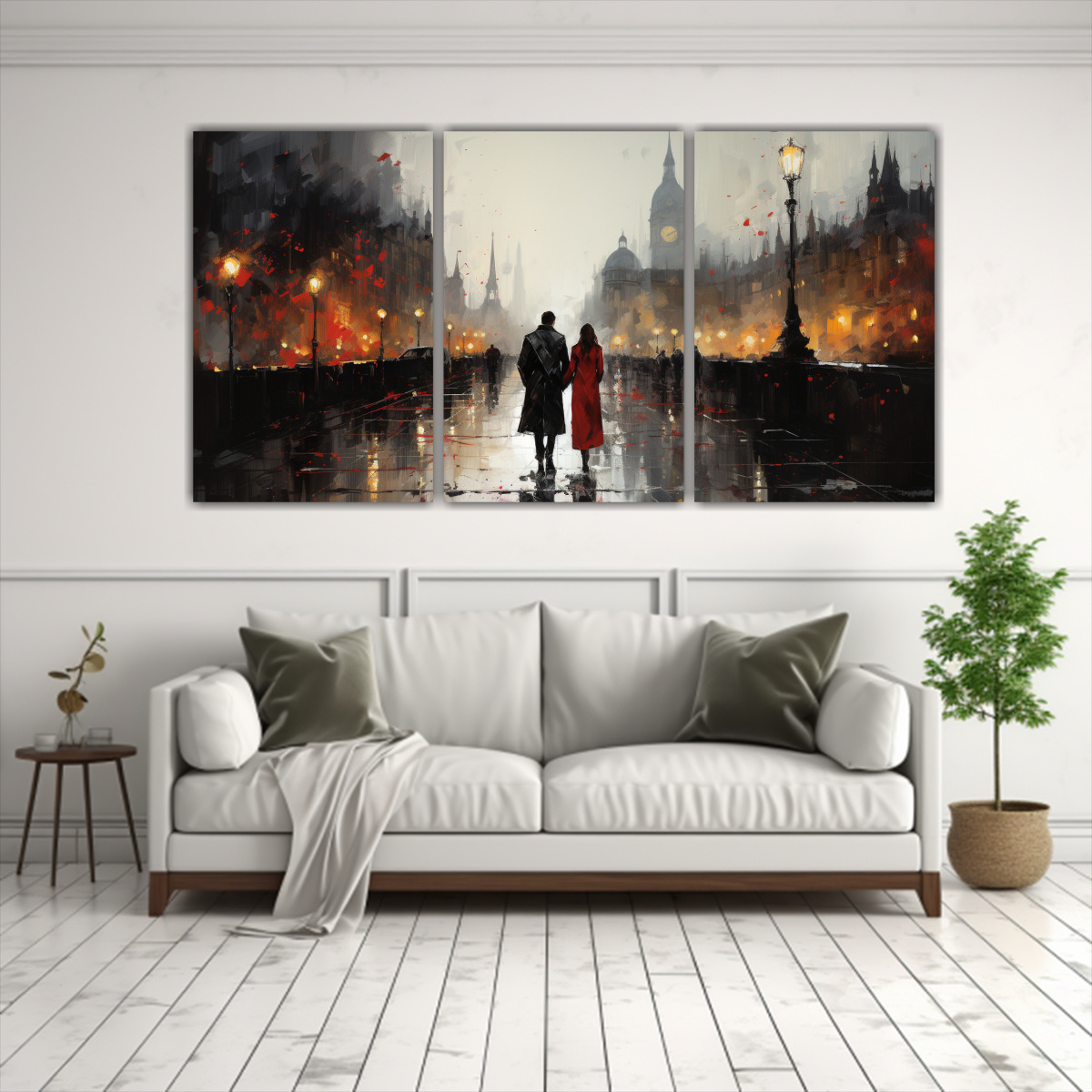 El Cuadro Composición Profundidad Pareja Caminando Puente Londres de DecoCuadros es ideal para crear un ambiente sofisticado en tu hogar Con colores plateados, azul marino grisaceo, gris, coral y carmesí, este cuadro aporta profundidad y estilo a cualquier habitación