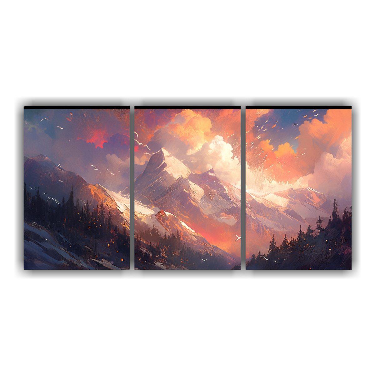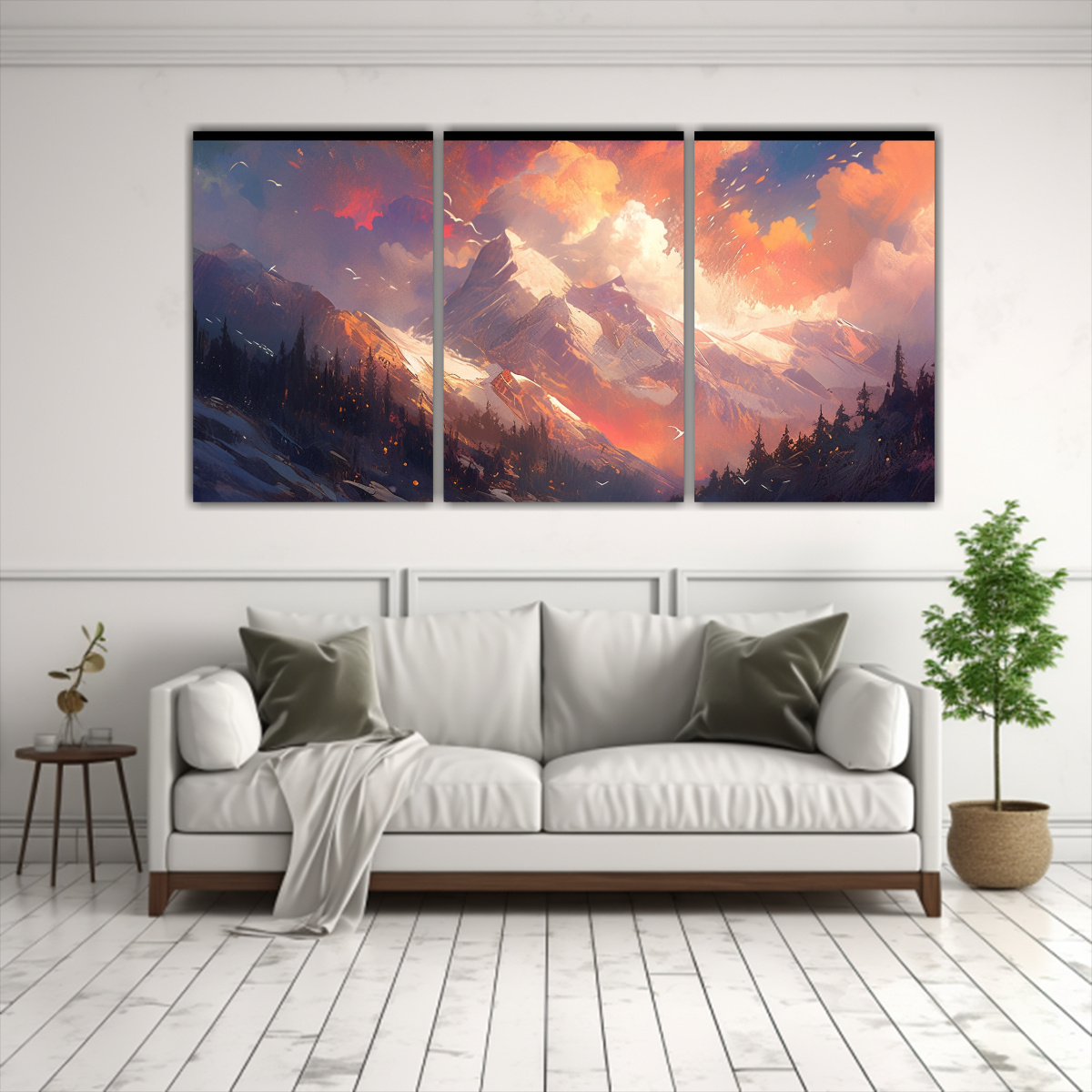Este Cuadro Abstracto de Montañas Nevadas con Arcoíris y tonos Naranja es ideal para colocar en el área de la sala de estar, creando un ambiente acogedor y colorido Combínalo con muebles en tonos neutros para resaltar su belleza