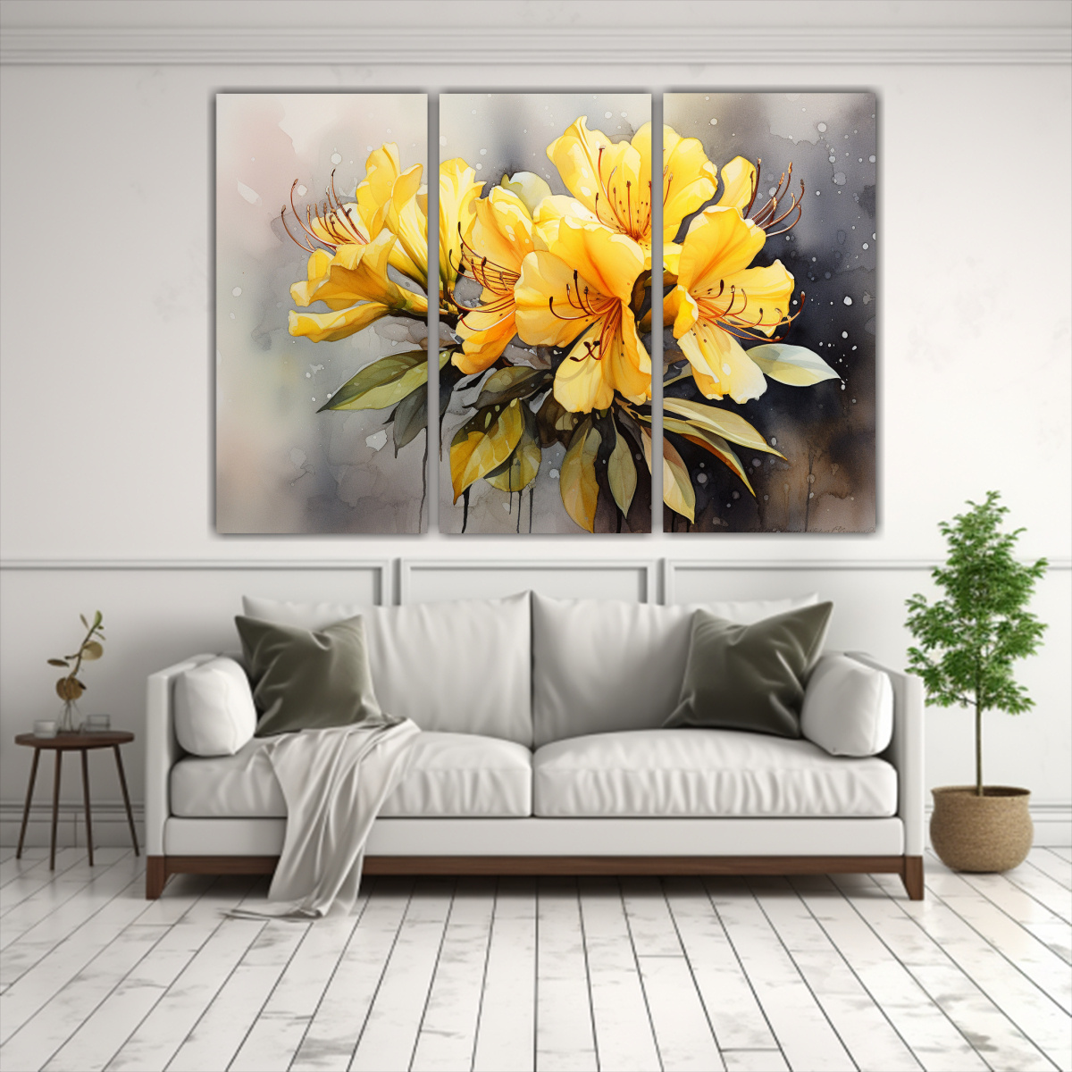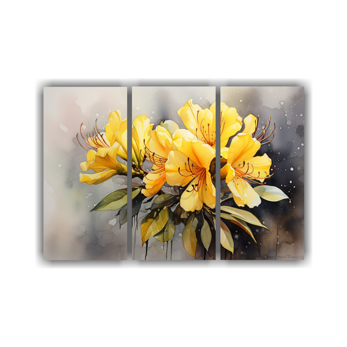Este hermoso cuadro de flores Rododendros en tonos amarillo y negro sería ideal para colocar en la pared principal de tu sala de estar, creando un punto focal vibrante Combínalo con cojines en tonos mostaza y detalles en dorado para lograr una decoración armoniosa y elegante