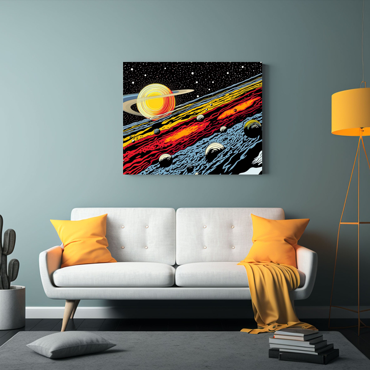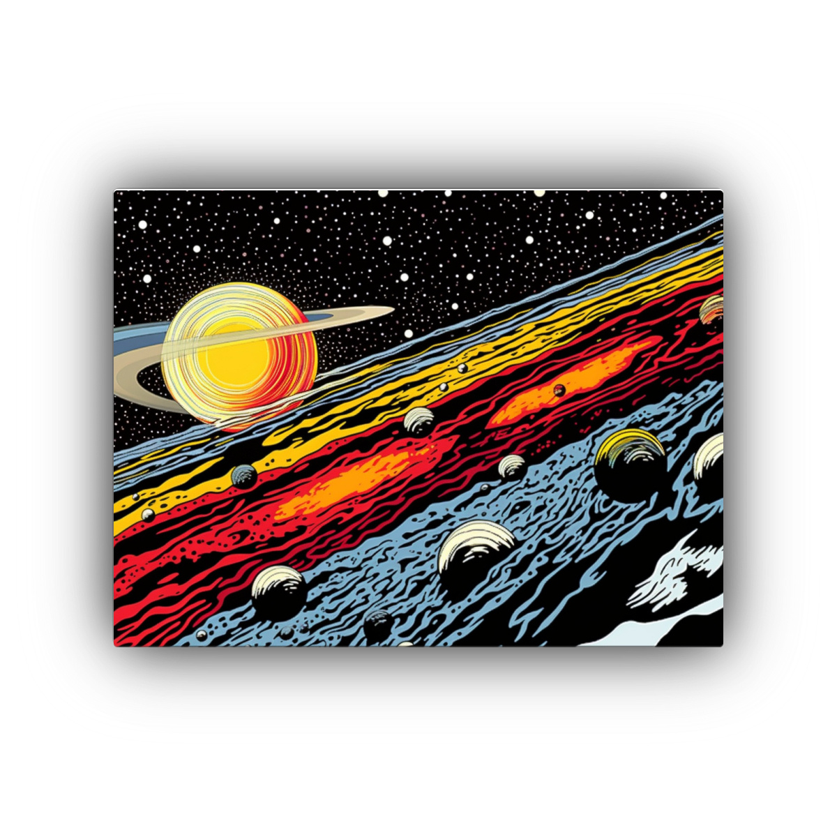 Dale un toque único a tu espacio con este cuadro que representa planetas en galaxias con un estilo Lichtenstein Envíos gratuitos en Santiago y rápidos a regiones ¡Diseños exclusivos y calidad insuperable!