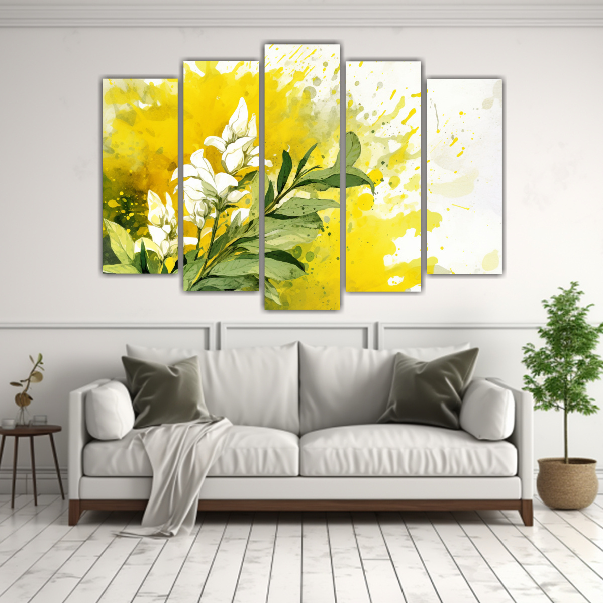 Coloca este set de 5 cuadros en la pared junto a la mesa del comedor para crear un ambiente acogedor y sofisticado Combina con elementos en tonos neutros y dorados para resaltar la elegancia de las hierbas salvia en amarillo y blanco