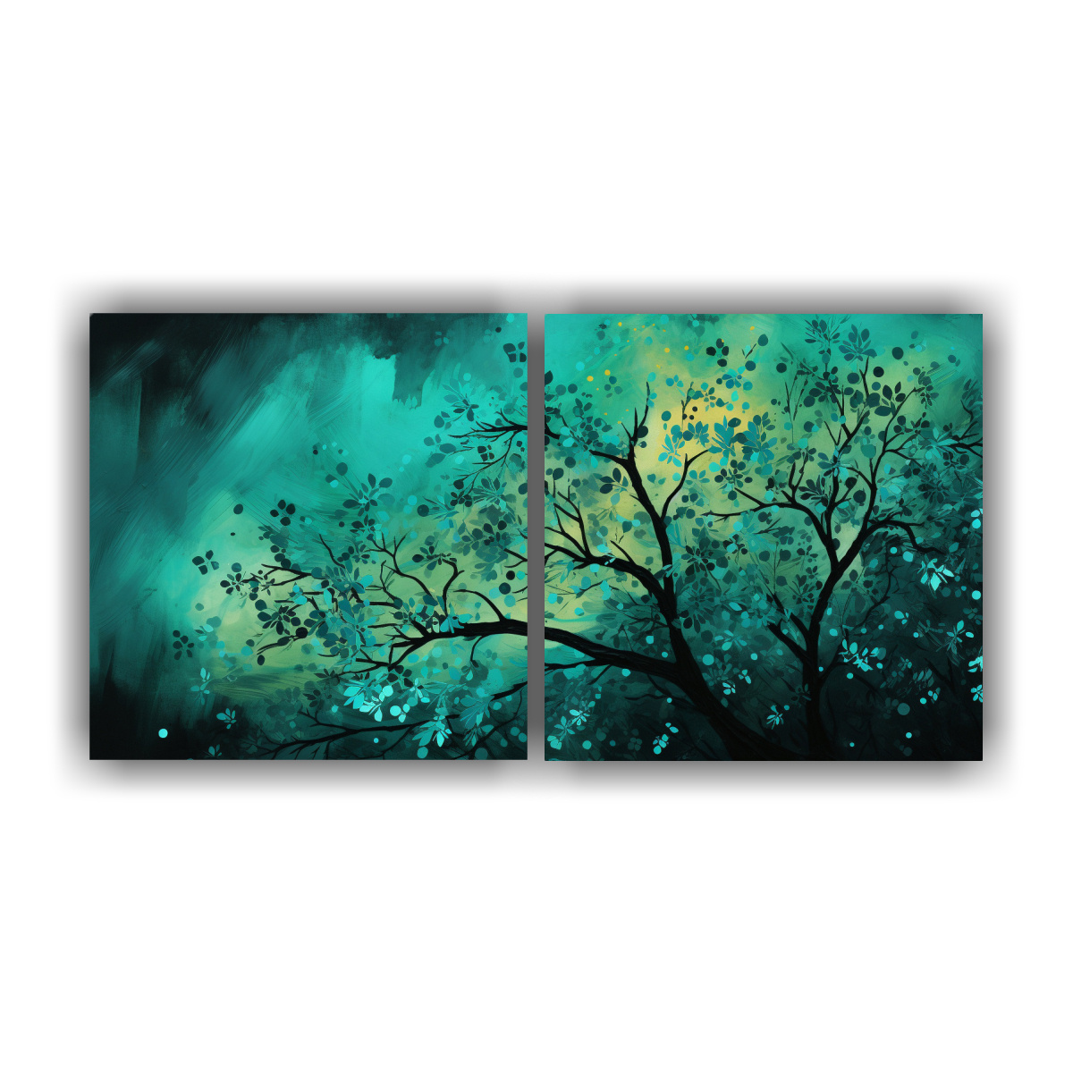 Cuadros De Comedor De Alta Calidad Con Bosque En Colores Verde Y Turquesa En Un Ambiente Neonoir