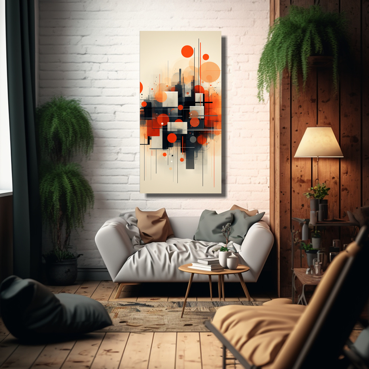 Este cuadro de composición creativa juvenil en colores beige, carmesí, azul marino grisáceo, coral y gris sería ideal para decorar una sala de estar moderna Colócalo sobre una pared de tonos neutros para crear un contraste llamativo Combínalo con muebles de líneas rectas y accesorios en colores suaves para lograr un ambiente armonioso y vanguardista