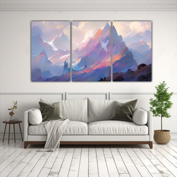 Renueva tus paredes con el set de 3 cuadros ‘A Famous Mountain Peaks And Ranges’ en tonos púrpuras y colores complementarios como azul, lila, gris y coral Impacta con diseños únicos y entrega express a regiones