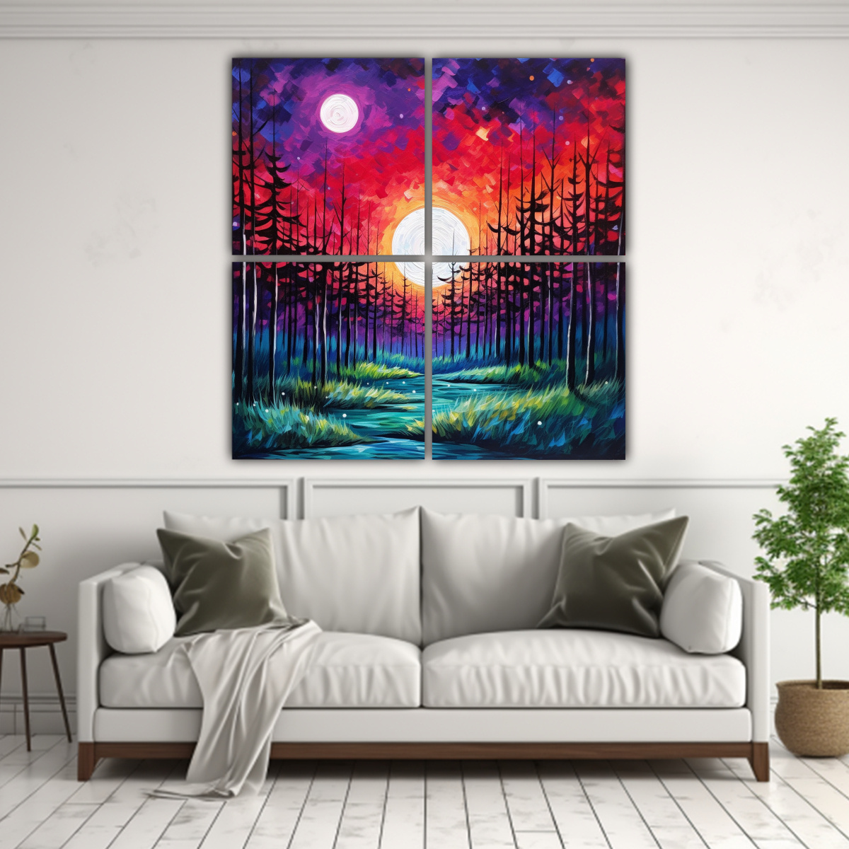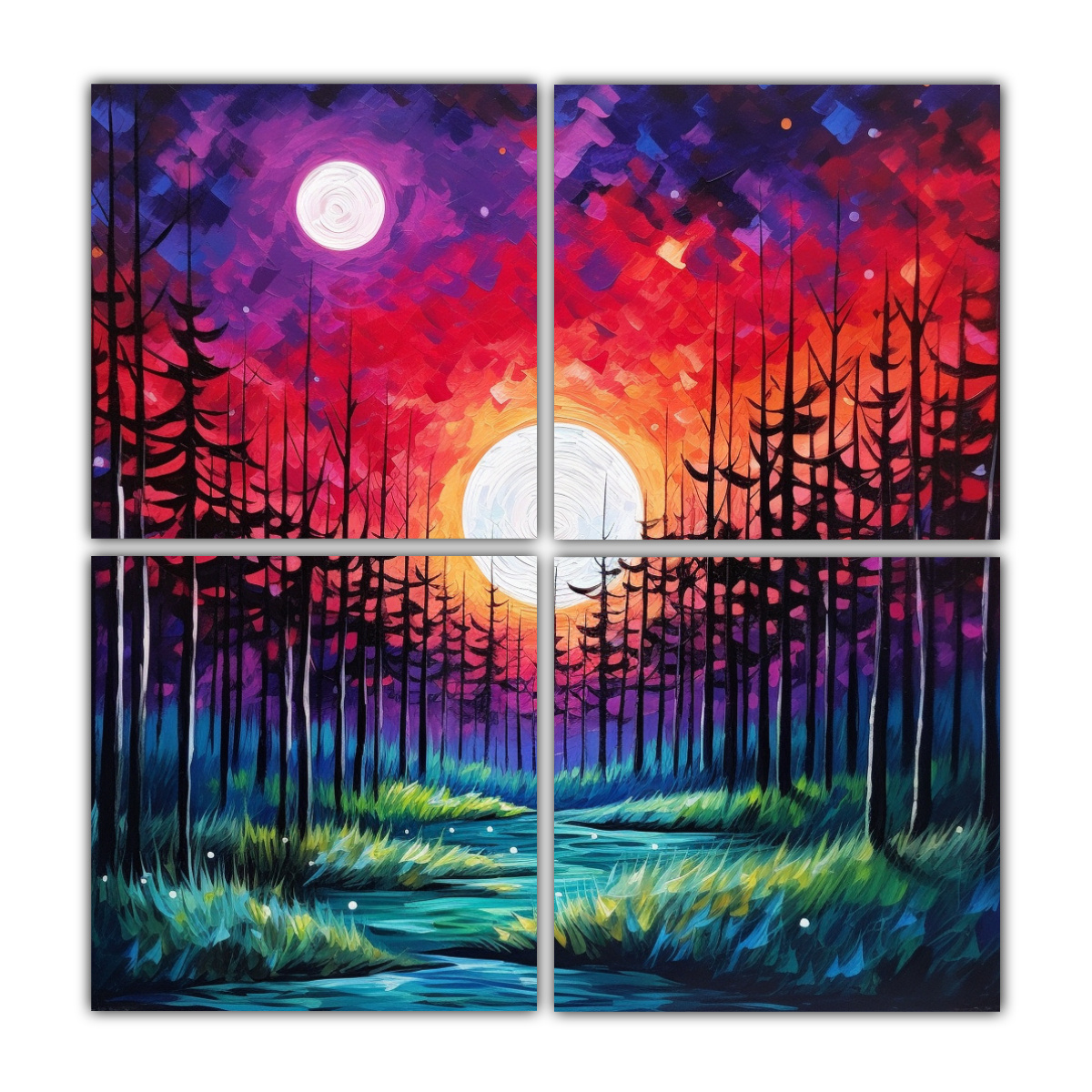 Decora tu hogar u oficina con los cuadros de decoración escena bosque azul marino, mar rojo estrellado, sol verde y cielo morado de DecoCuadros Diseños exclusivos y entrega rápida