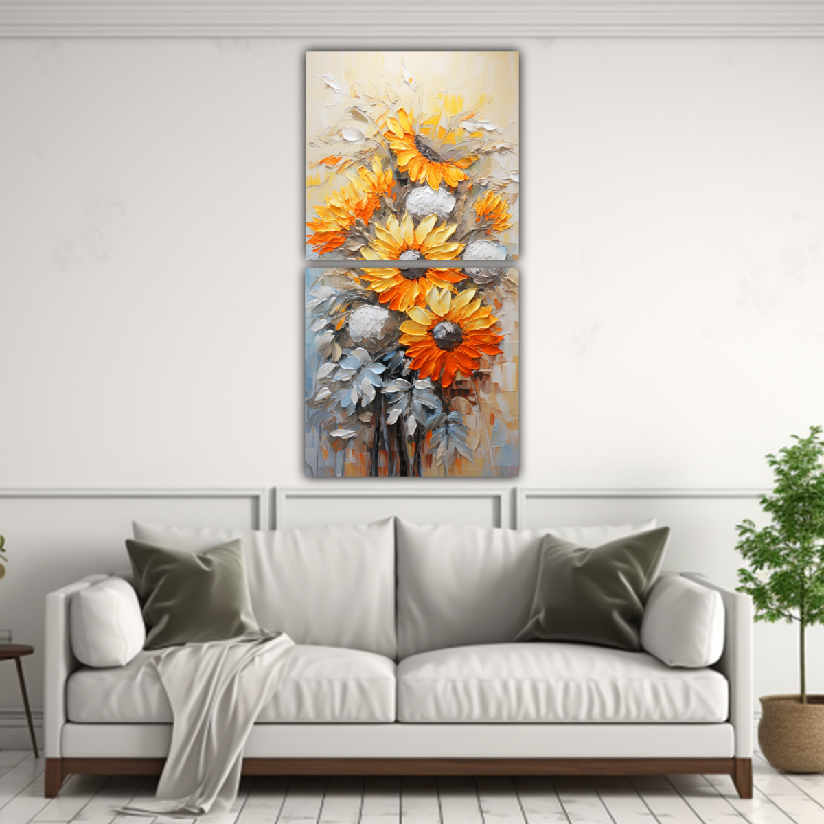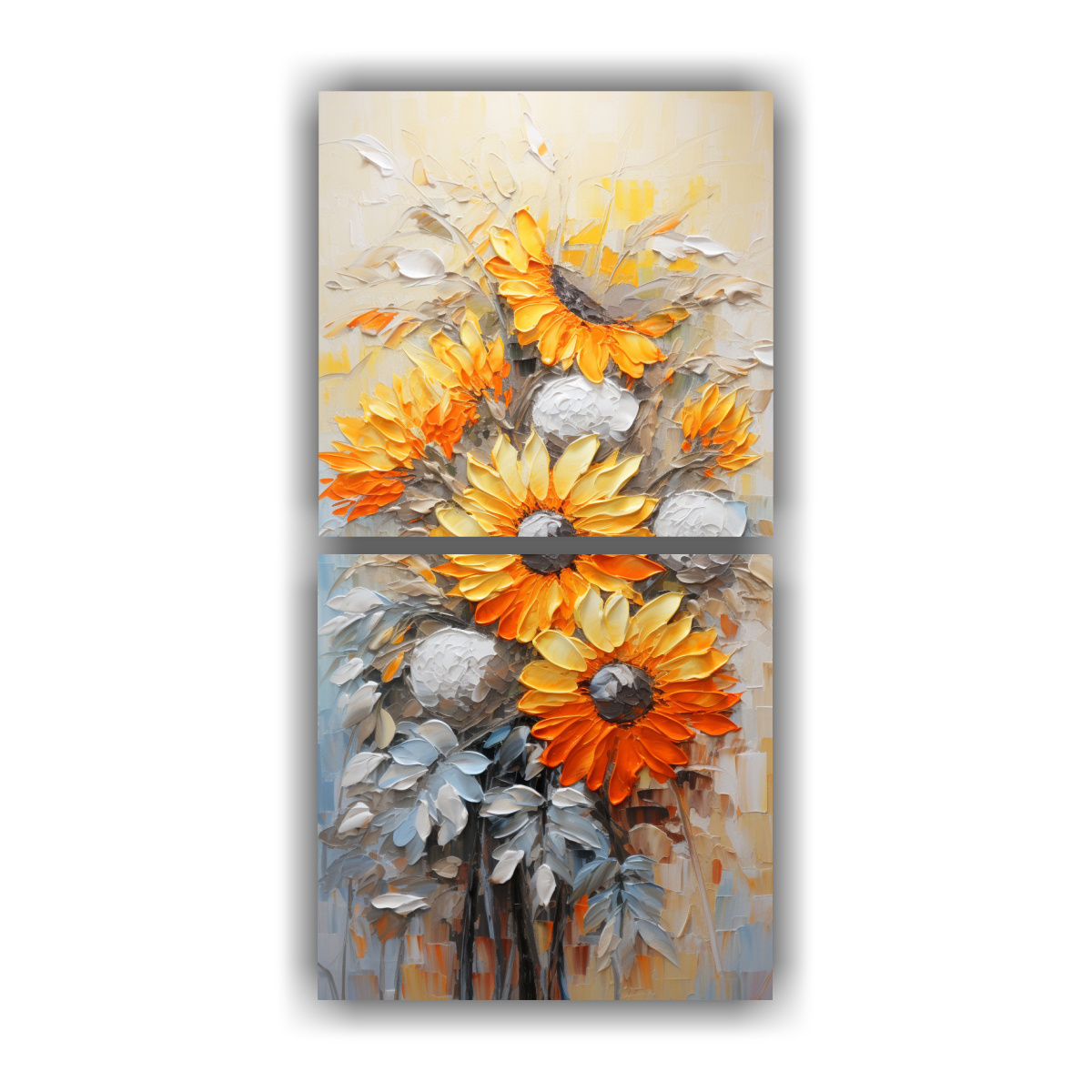 Este cuadro con pintura de girasoles naranjas sobre lienzo es ideal para decorar salas de estar, dormitorios o espacios de trabajo Combínalo con muebles en tonos neutros como el blanco, beige o gris para resaltar su vibrante belleza Además, puedes colocarlo en una pared principal o en un rincón especial para crear un punto focal en la habitación