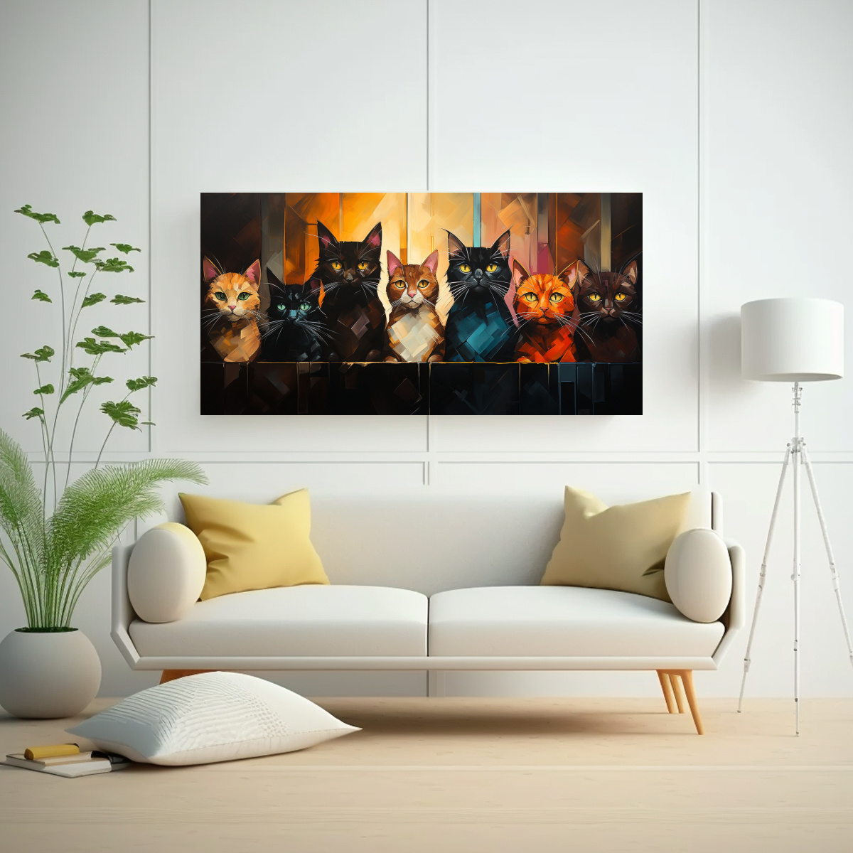 Este cuadro de gatos en tonos cálidos se vería perfecto en la sala de estar, creando un ambiente acogedor y elegante Combínalo con cojines en tonos similares para una decoración armoniosa ¡Atrévete a darle un toque único a tu hogar con DecoCuadros!