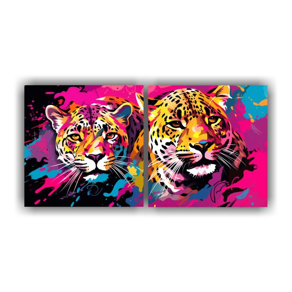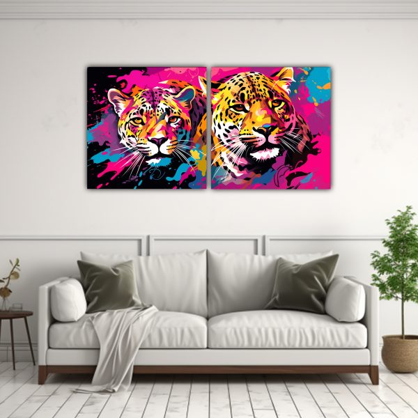 Agrega un toque único a tu decoración con este cuadro de leopardos en colores vibrantes Ideal para salas de estar o dormitorios modernos Combínalo con muebles neutros para resaltar su belleza