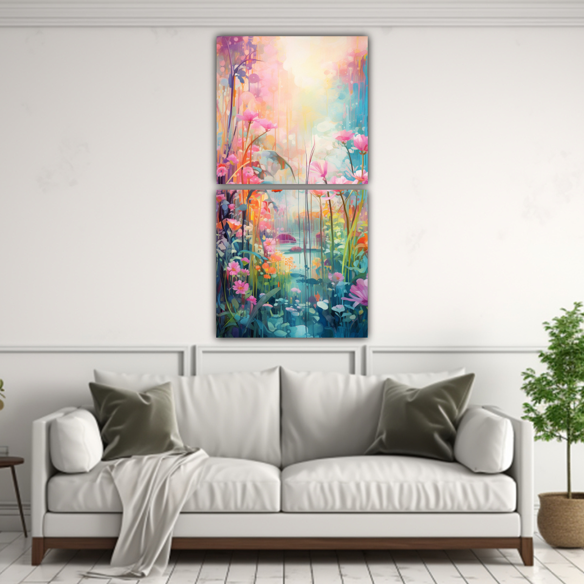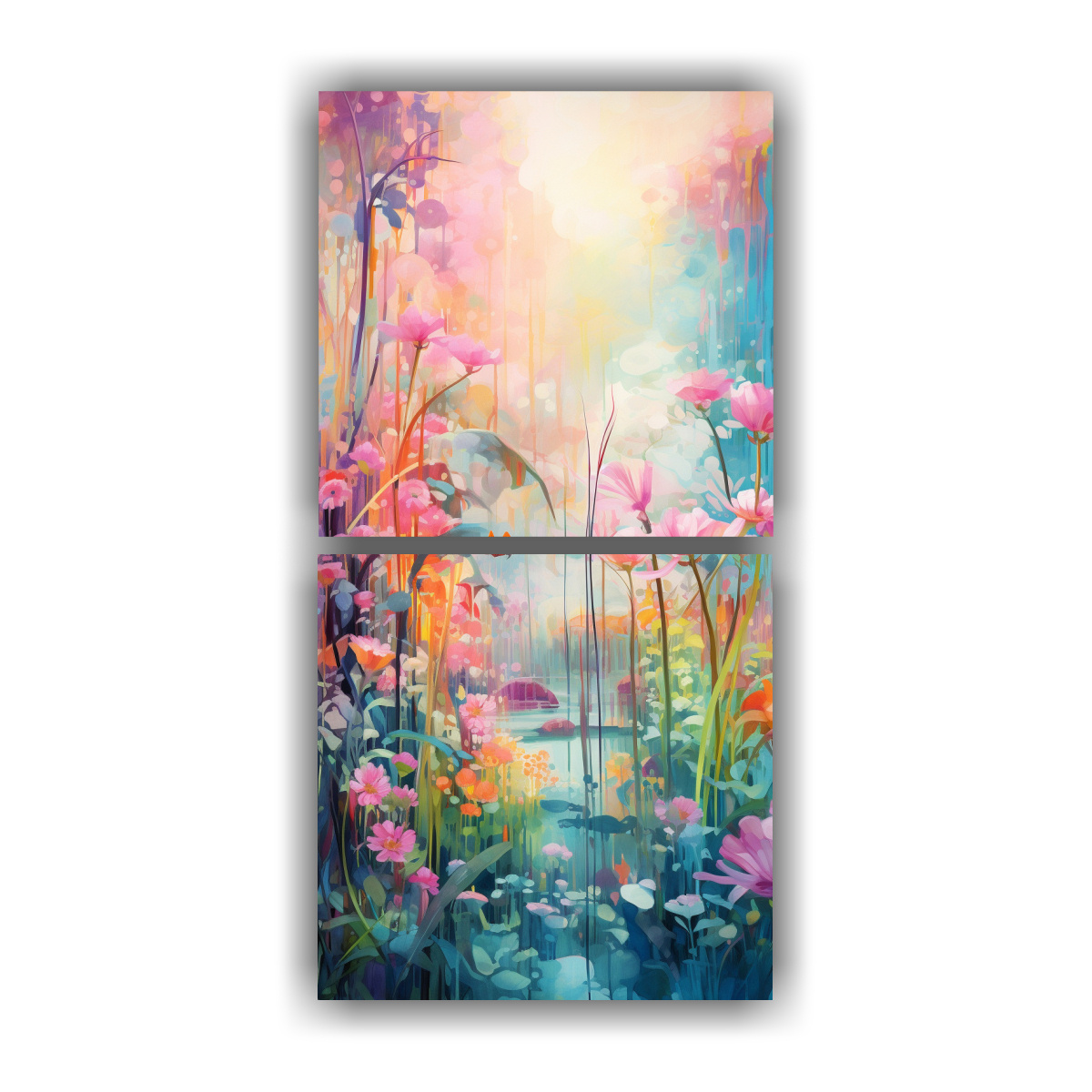 DecoCuadros ofrece cuadros de tela abstractos en venta con diseños exclusivos que capturan la esencia de un jardín tranquilo al amanecer Nuestros cuadros, impresos en tela de alta calidad con bastidores de madera, están disponibles en colores como azul marino grisaceo, plateado, gris, carmesí, coral, turquesa y beige Garantizamos la mejor calidad del mercado y los precios más económicos Además, ofrecemos entregas rápidas y gratuitas en Santiago, y envíos express a regiones