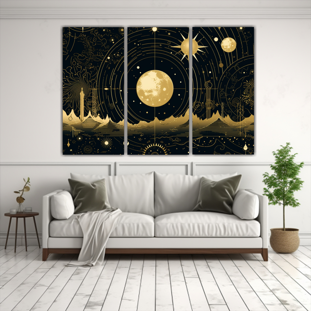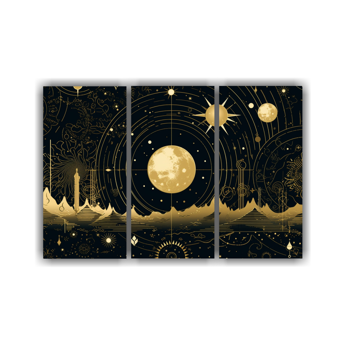 Cuadros De Tela Con Lunas Doradas En El Cielo: Estilo Alquímico.