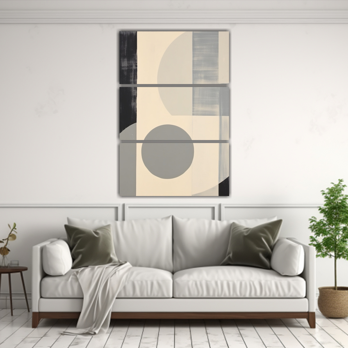 Este cuadro abstracto con formas geométricas y tonos azul marino grisáceo, beige, gris y plateado sería perfecto para decorar tu sala de estar o estudio Combínalo con muebles de colores neutros y detalles plateados para crear un ambiente moderno y sofisticado ¡Atrévete a darle un toque artístico a tu hogar!