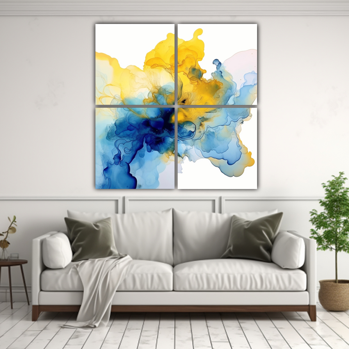 Decora tus espacios con elegancia y expresividad con los Cuadros Decorativos Azul y Amarillo en Acuarela Cuadriptico de DecoCuadros Nuestros cuadros impresos en tela de alta calidad con bastidores de madera añadirán un toque de color y estilo a tu hogar Los tonos dorado, verde azulado, beige, turquesa, amarillo claro, plateado, azul marino grisáceo, chocolate y gris se combinan en una hermosa composición que capturará la atención de todos