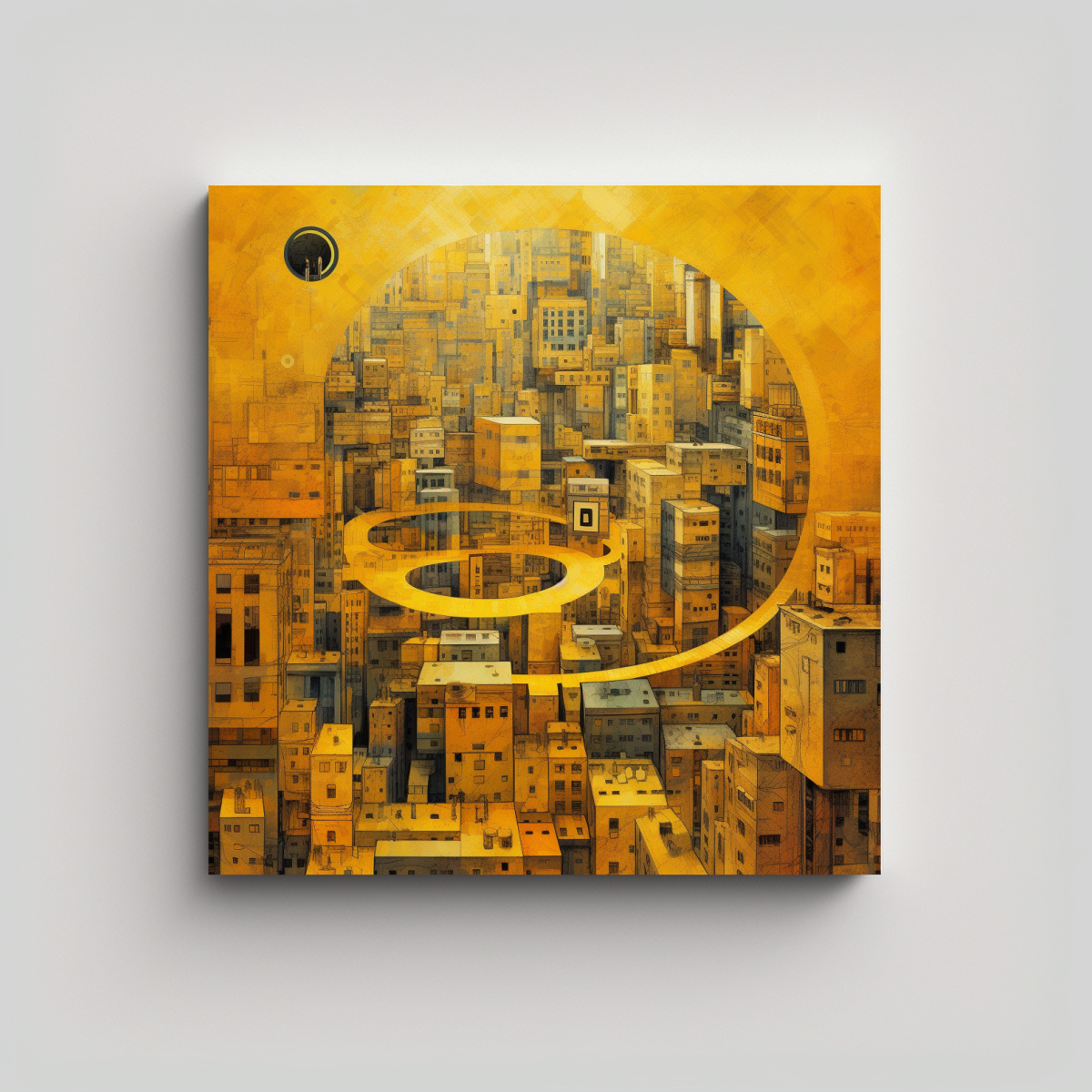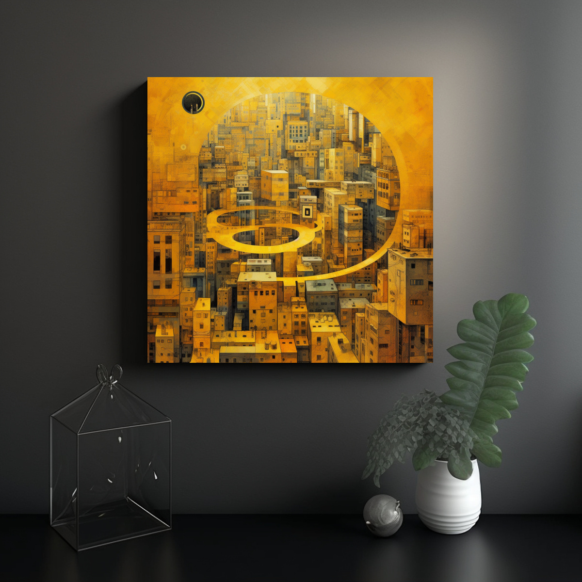 Añade sofisticación a tu cocina con este lienzo forma para cocina Yellow city with perfect circles Con una combinación de colores vibrante y elegante, este cuadro se adapta perfectamente a cualquier estilo de decoración Dale un toque moderno y único a tu espacio culinario