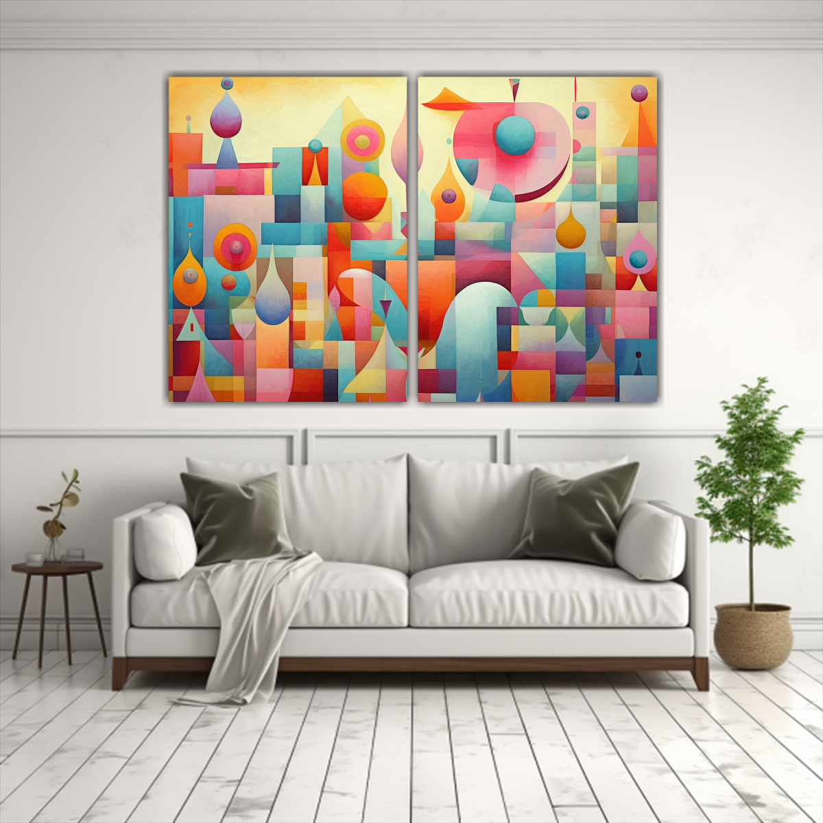 Este set de telas en bastidor calidos época whimsical con figuras geométricas y textura colorida quedará perfecto en tu sala de estar, sobre el sofá principal Combínalo con cojines en tonos neutros y una alfombra de pelo largo para crear un ambiente acogedor y moderno