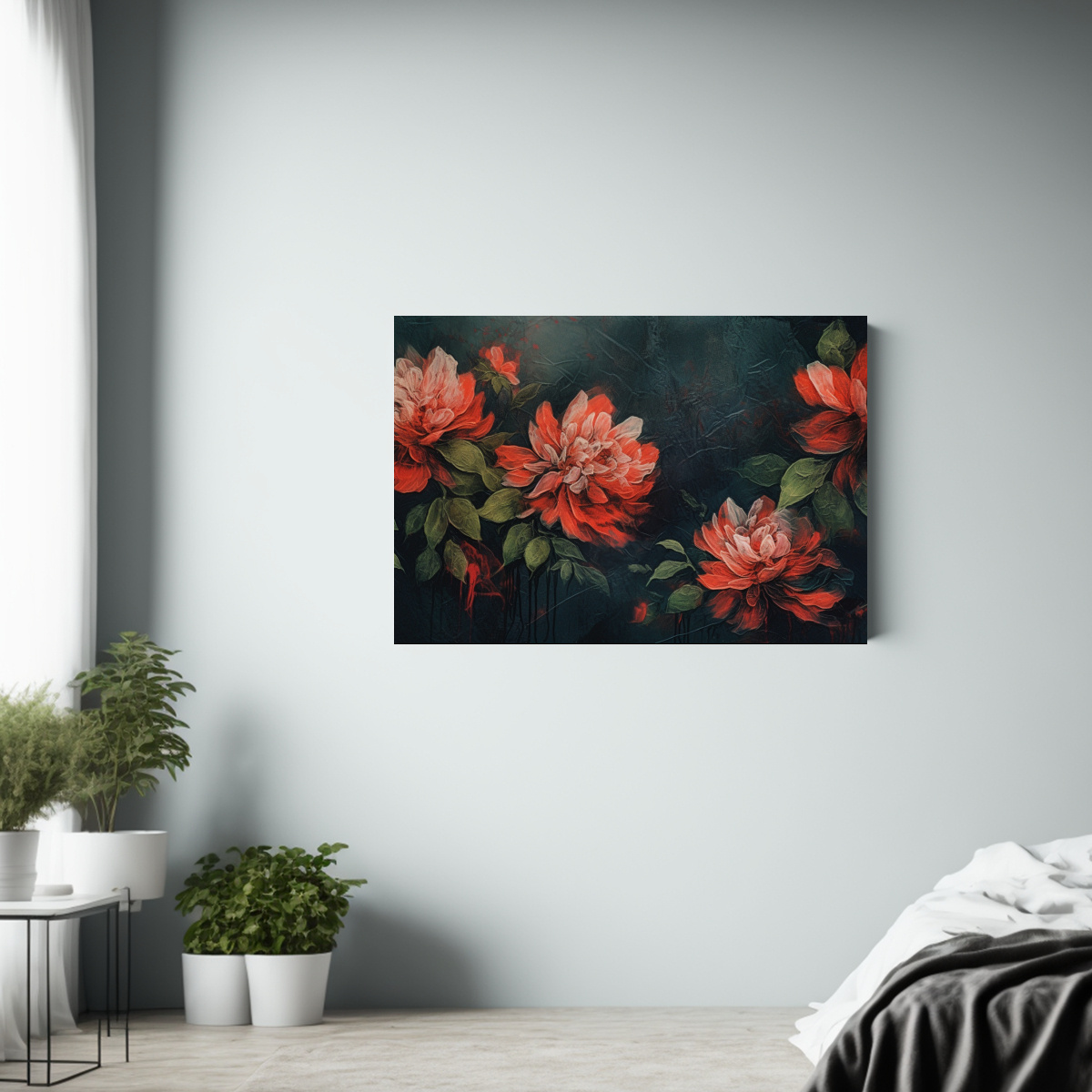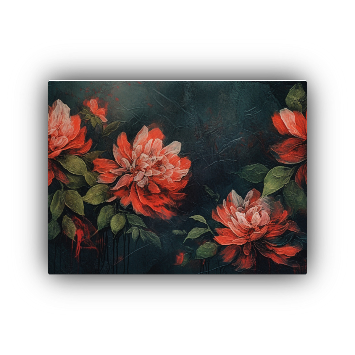 Agrega un toque de fantasía a tu hogar con estas sutiles flores rojas y verdes en un fondo oscuro y con textura Diseños exclusivos y entrega express a regiones Renueva tu espacio con nuestra amplia variedad de cuadros decorativos