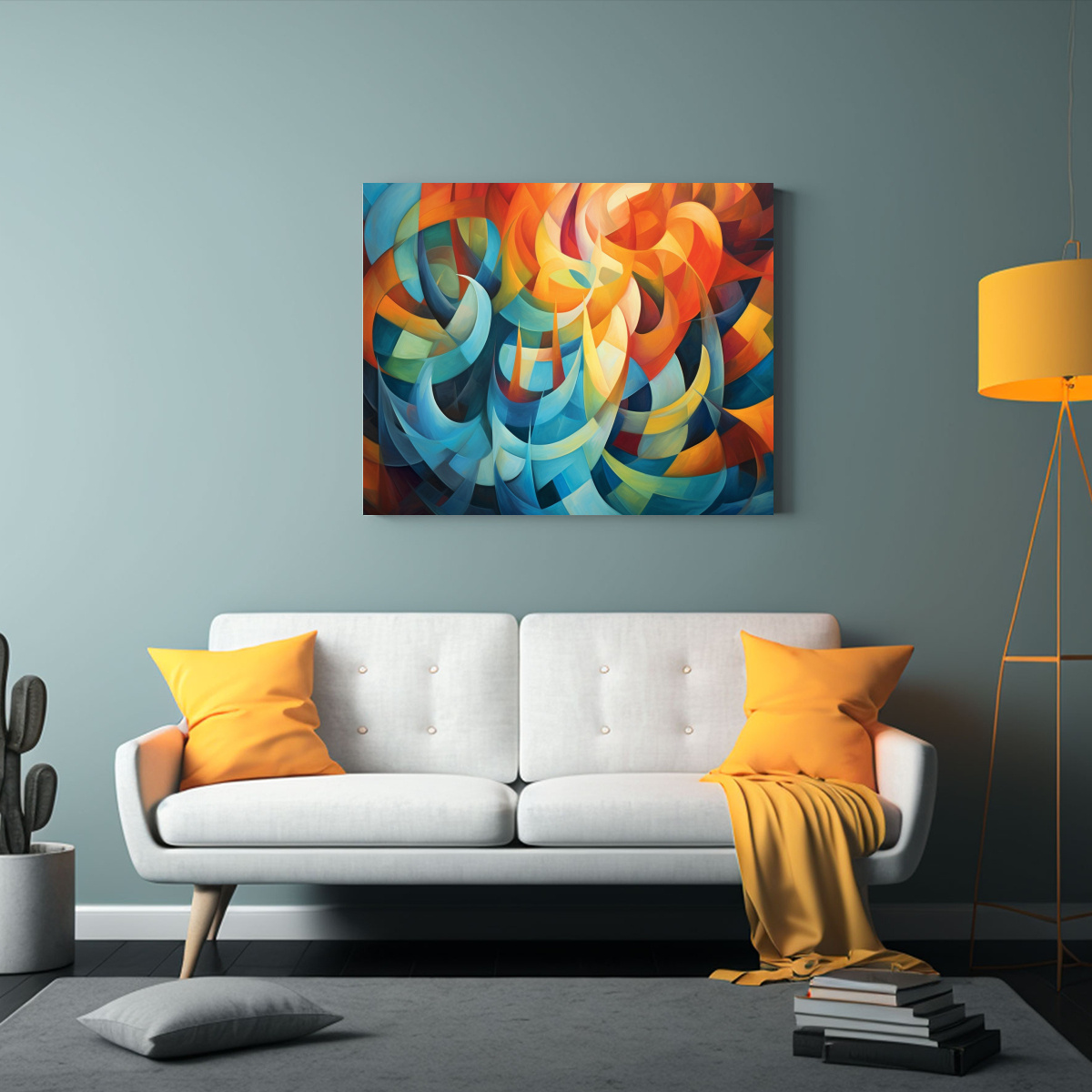 Este cuadro abstracto en tonos coral, turquesa y menta sería ideal para decorar una sala de estar moderna Colócalo sobre un sofá gris para lograr un contraste elegante y vibrante Complementa con cojines en tonos plateados y verdes para un ambiente sofisticado