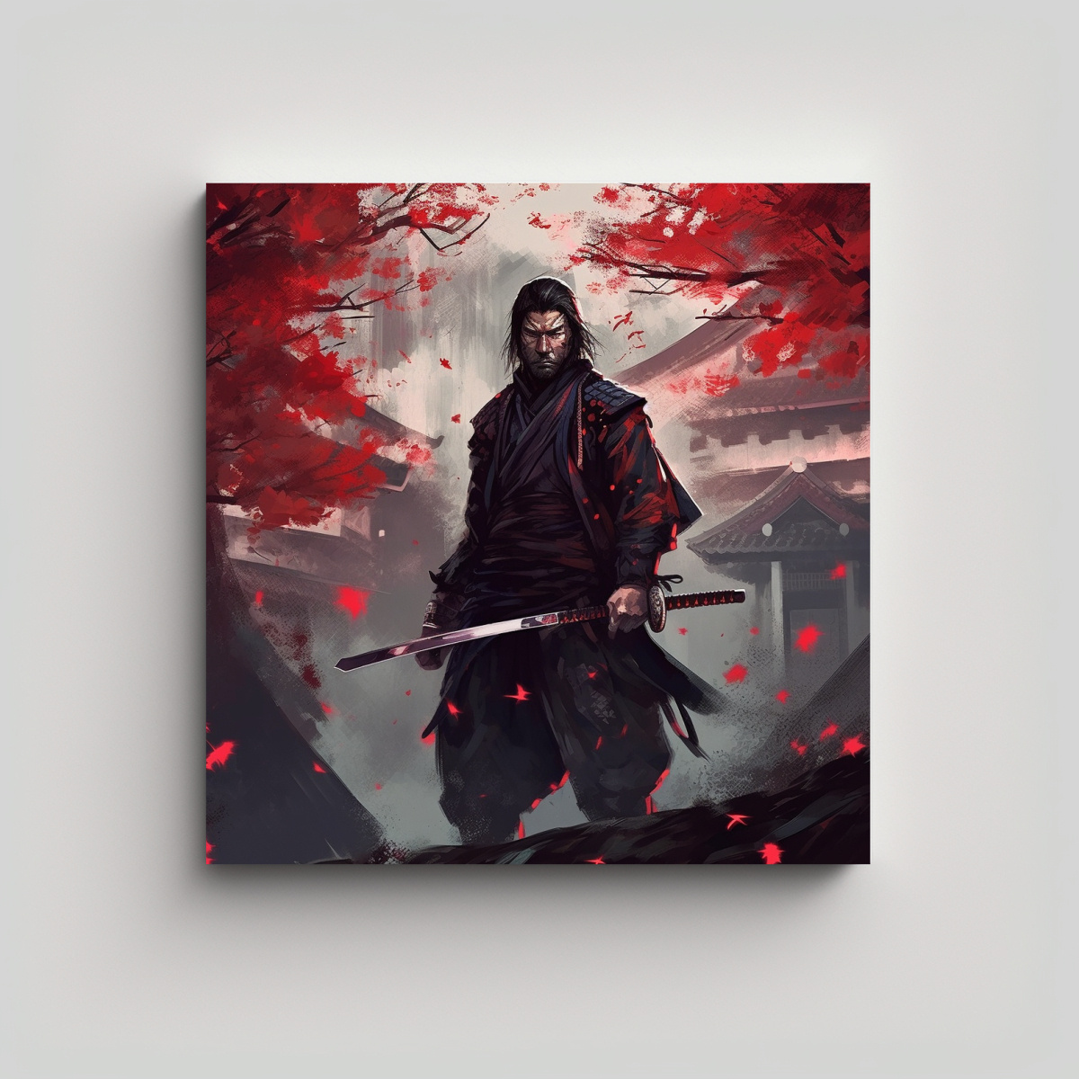 Coloca este cuadro Hermoso Ronin en un lugar destacado de tu sala de estar, sobre un sofá de color neutro para resaltar los tonos azules, carmesí y grises Combínalo con cojines en tonos plateados y chocolate para una decoración armoniosa