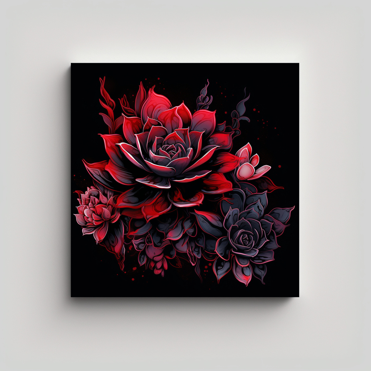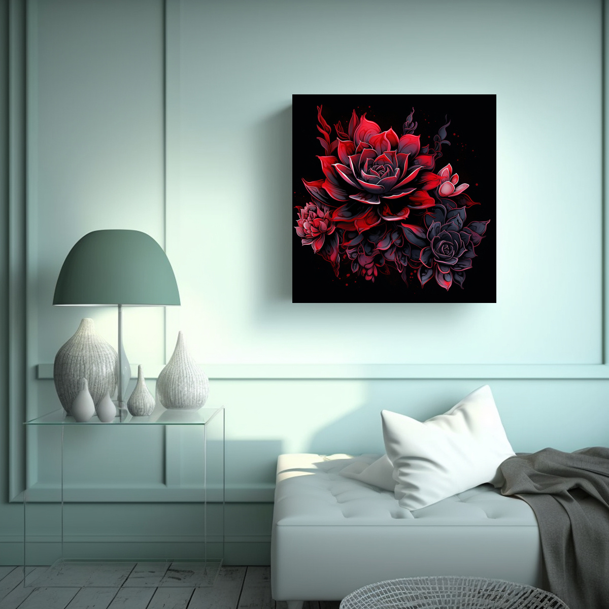 Cuadros Decorativos De Composición Enigmática De Plantas Suculentas En Colores Rojo Y Negro Con Atmósfera Neonoir