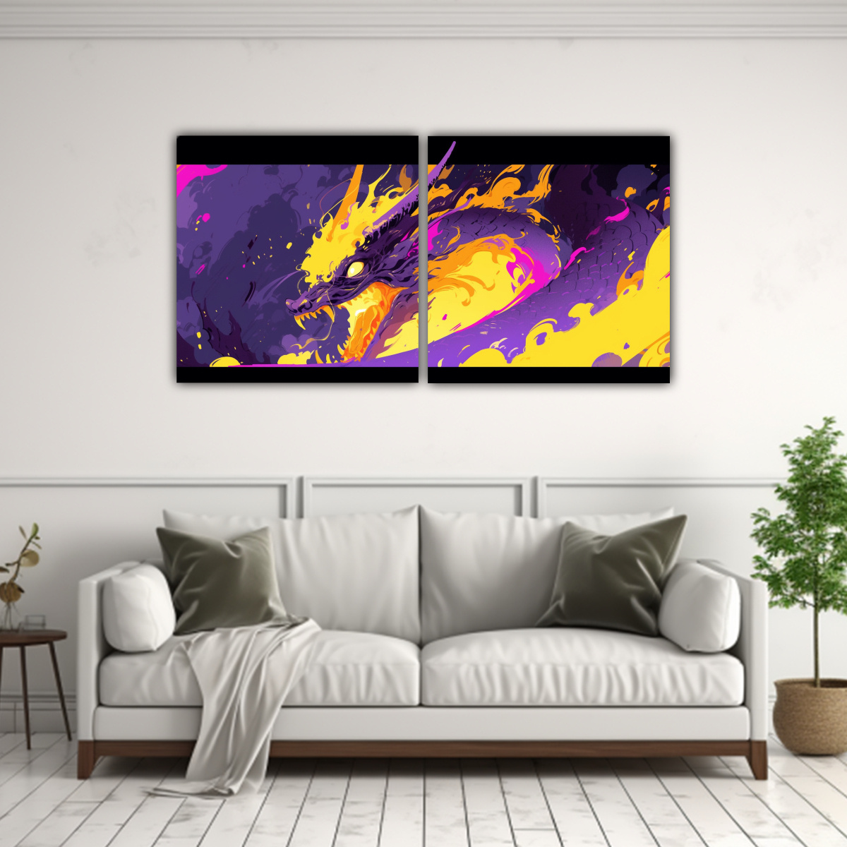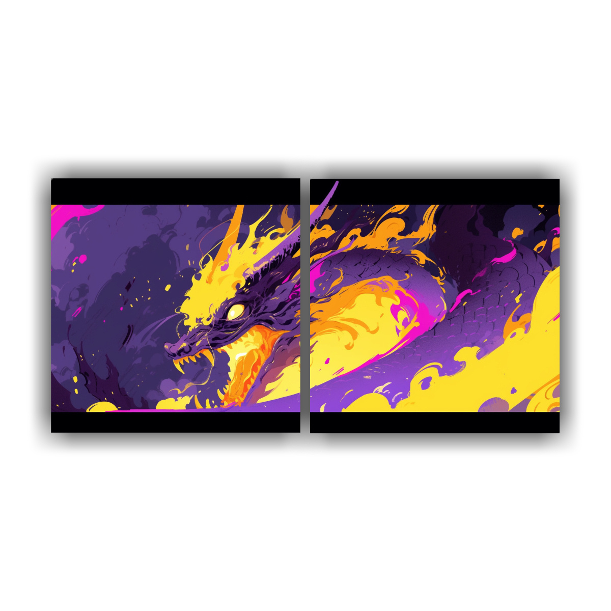 Cuadros Decorativos De Dragón En Amarillo Y Púrpura Para Comedor Neonoir Atmosfera.