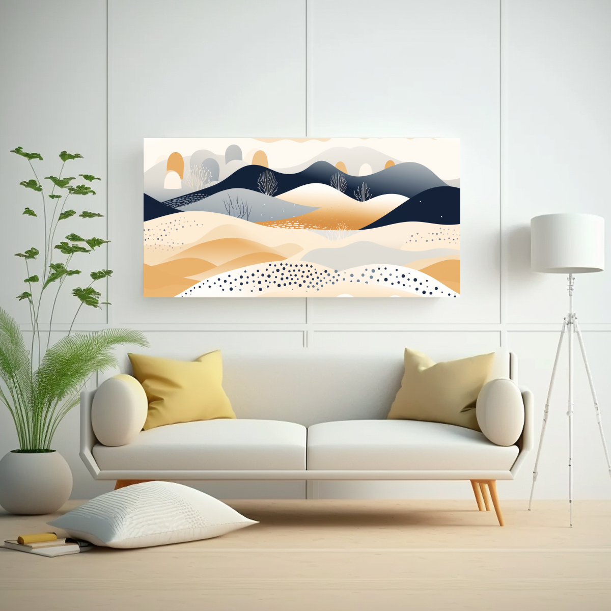 Este cuadro de paisajes escandinavos abstractos en colores Azul Marino grisaceo, Beige, Coral, Plateado y Gris es perfecto para decorar tu sala de estar o dormitorio Combínalo con muebles de colores neutros y accesorios en tonos plateados para crear una atmósfera elegante y moderna