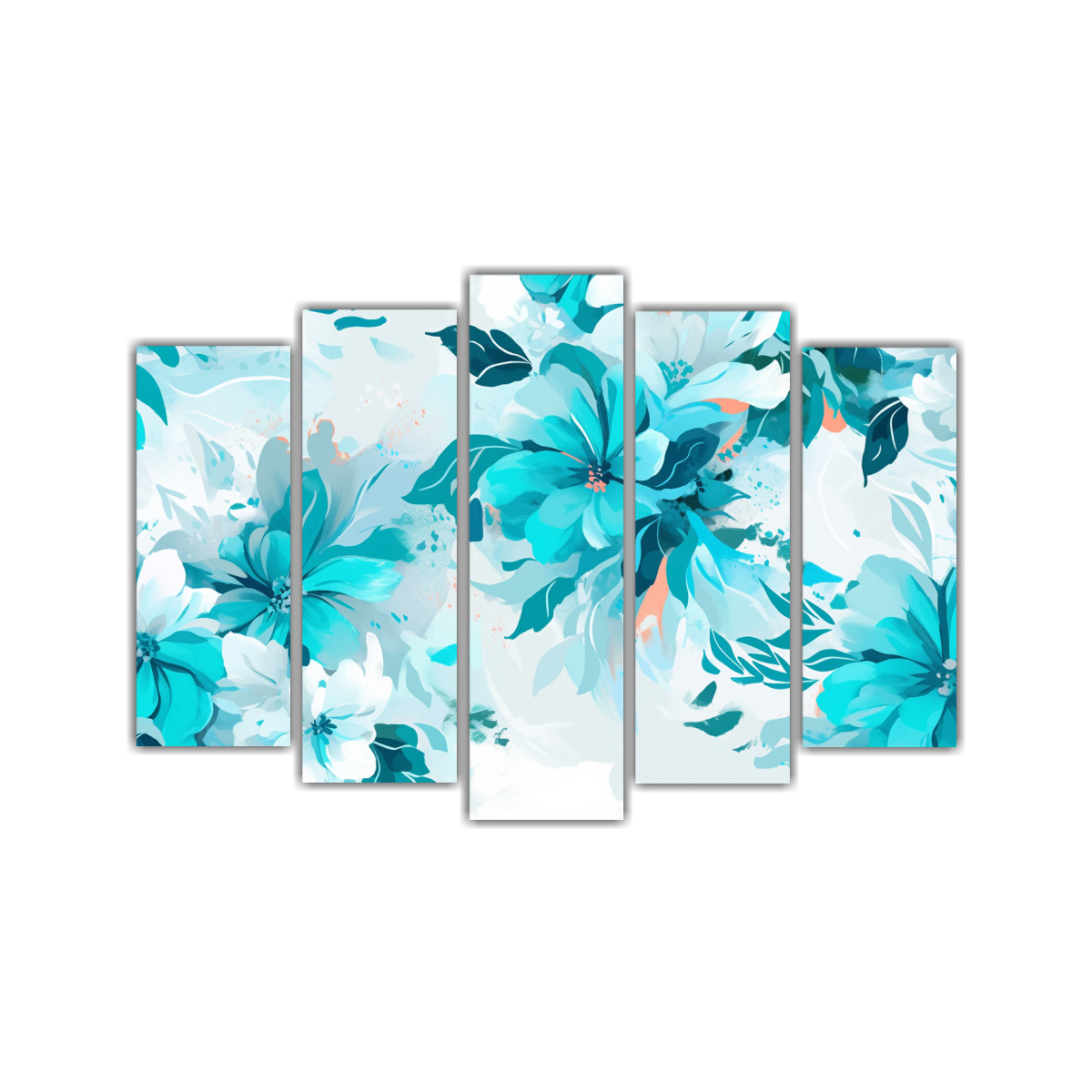 Set de 5 cuadros en tonos urbano blanco y turquesa con ambiente neonoir Colores menta, beige, turquesa, azul marino grisaceo, plateado, verde azulado, coral, rosado claro y gris ¡Renueva tu espacio con estilo y originalidad!