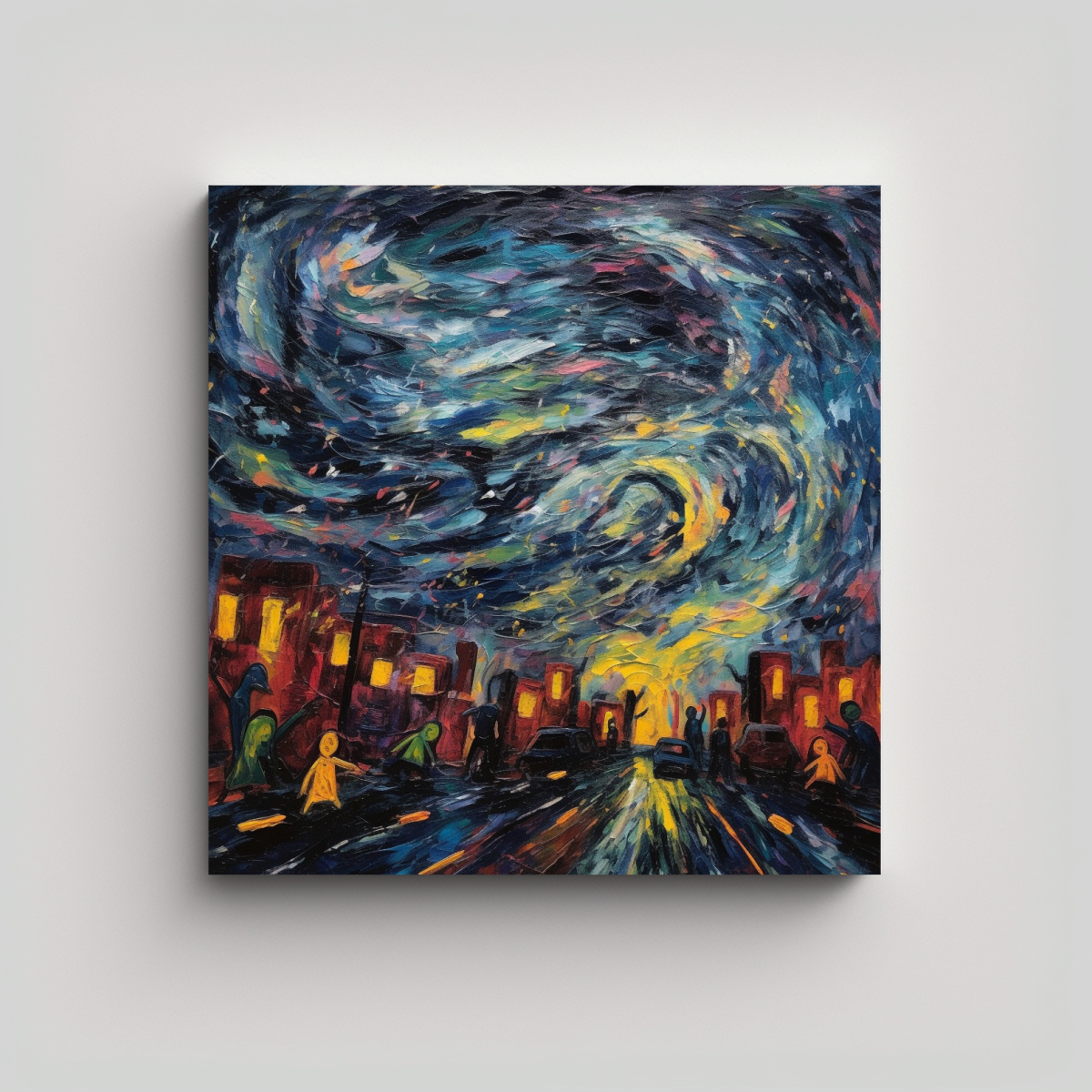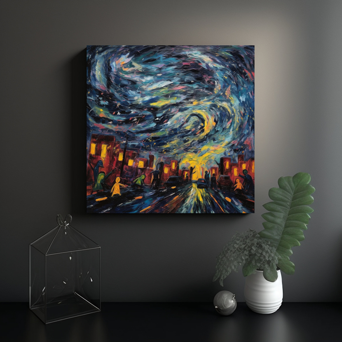 Admira la intensidad y la belleza de los tonos exuberantes en este cuadro de expresionismo, perfecto para un ambiente moderno y elegante Transforma tu espacio con esta pieza única que refleja una noche tormentosa llena de emoción y misterio ¡Hazte con él ahora!