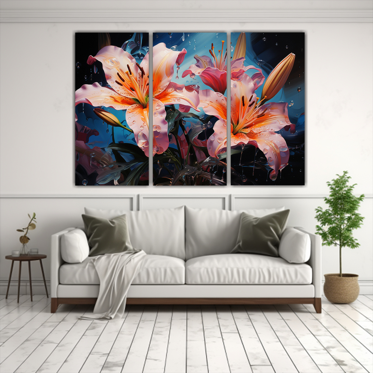 Este cuadro de flores lirios turquesa y rosa quedará espectacular en tu sala de estar sobre un sofá de color neutro Su paleta de colores vibrantes añadirá frescura y sofisticación a tu ambiente Combínalo con cojines en tonos turquesa para resaltar su belleza