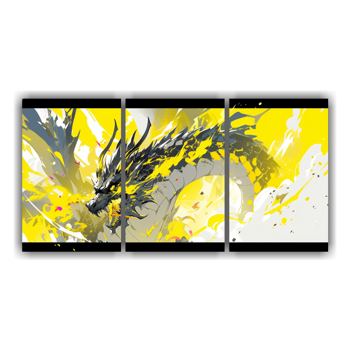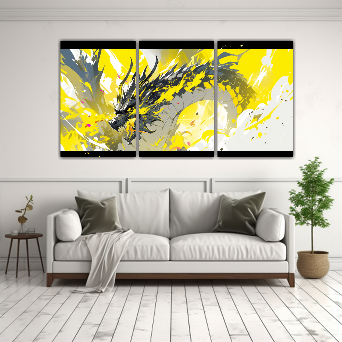 Coloca este set de 3 cuadros en una pared blanca para crear un impacto visual Combina con muebles de tonos neutros y detalles en amarillo para resaltar la temática del dragón Ideal para espacios juveniles o salas de entretenimiento