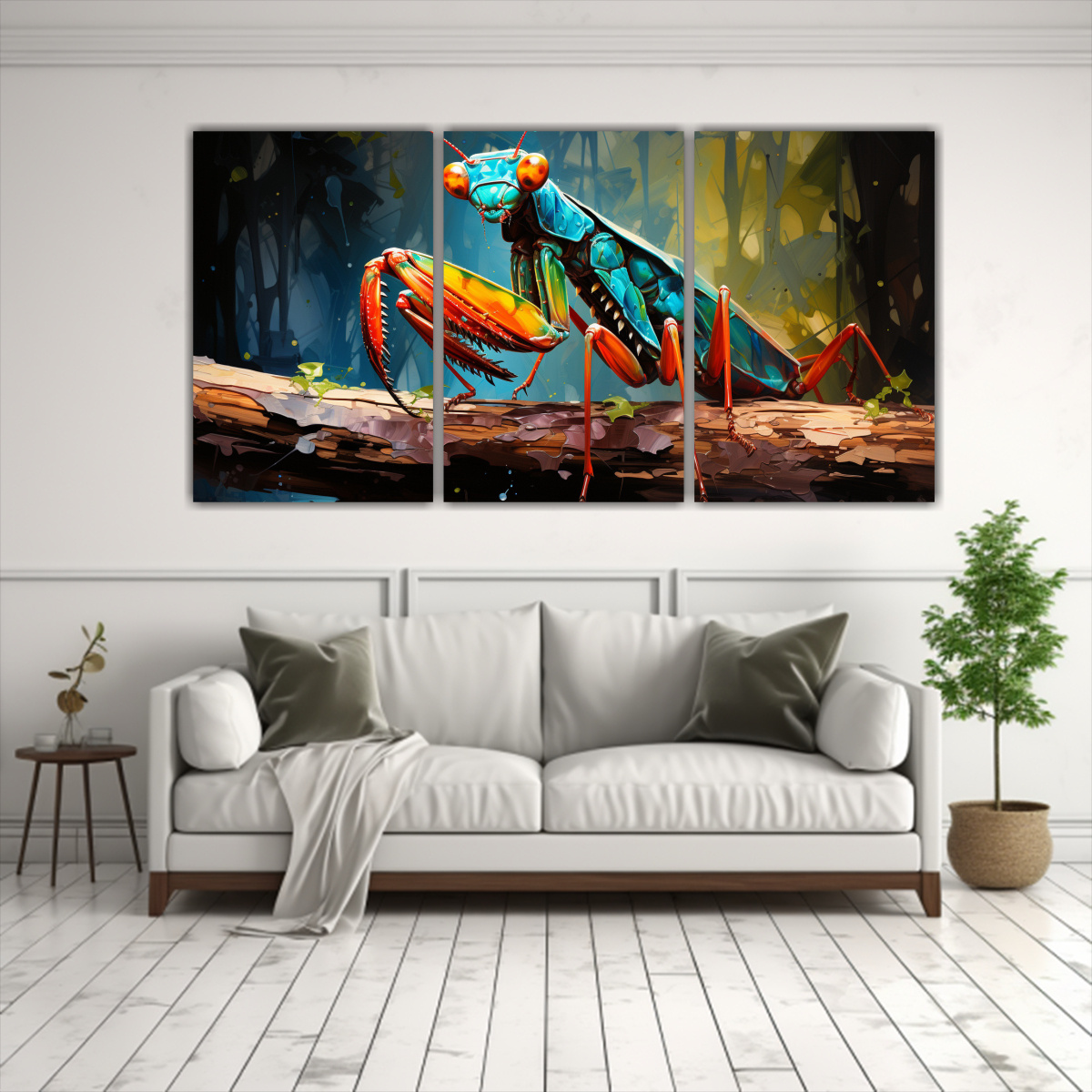 Para potenciar la energía de tu sala de estar, coloca el Tríptico Mantis Religiosa en la pared principal sobre un sofá neutro Acompáñalo con cojines en tonos Beige y Chocolate para crear un equilibrio perfecto de colores y texturas