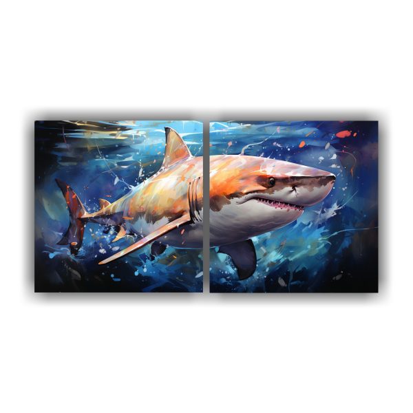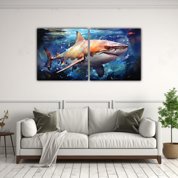 El Set de 2 Telas en Bastidor Full Color A Bull Shark in Pearl AND Sunlit Colors neo pop art destaca por sus tonos plateados, azul marino grisaceo, gris, turquesa, coral y carmesí Diseños exclusivos para tu hogar
