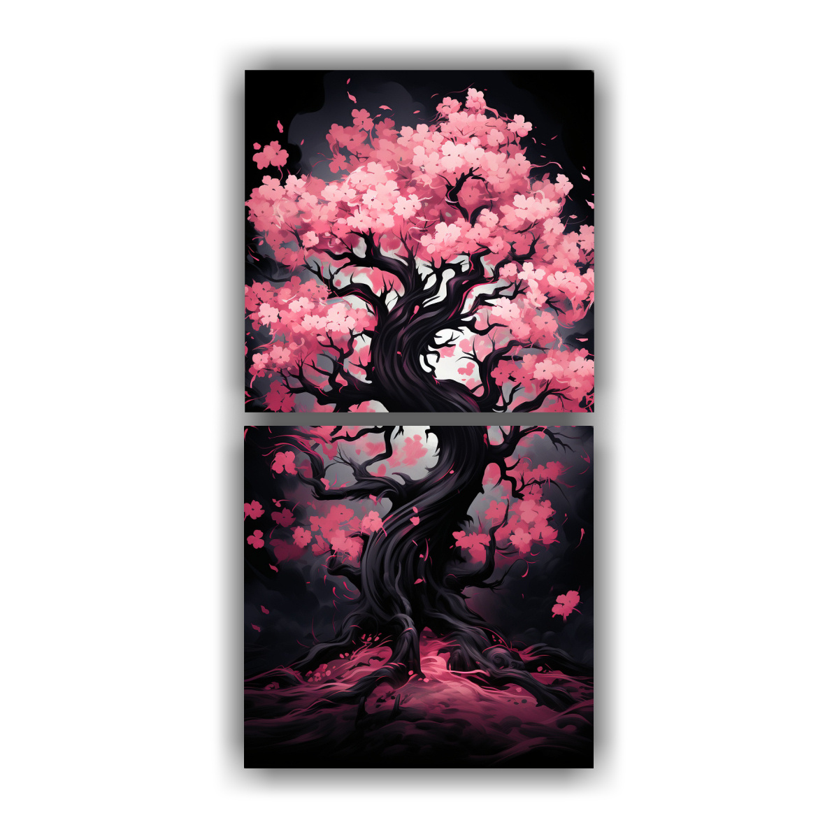 Decora tu hogar con los hermosos cuadros decorativos de árbol de roble en negro y rosa Crea una atmosfera neonoir con colores coral, negro, azul marino grisaceo, beige, gris y carmesí Descubre diseños exclusivos y calidad premium en DecoCuadros