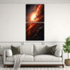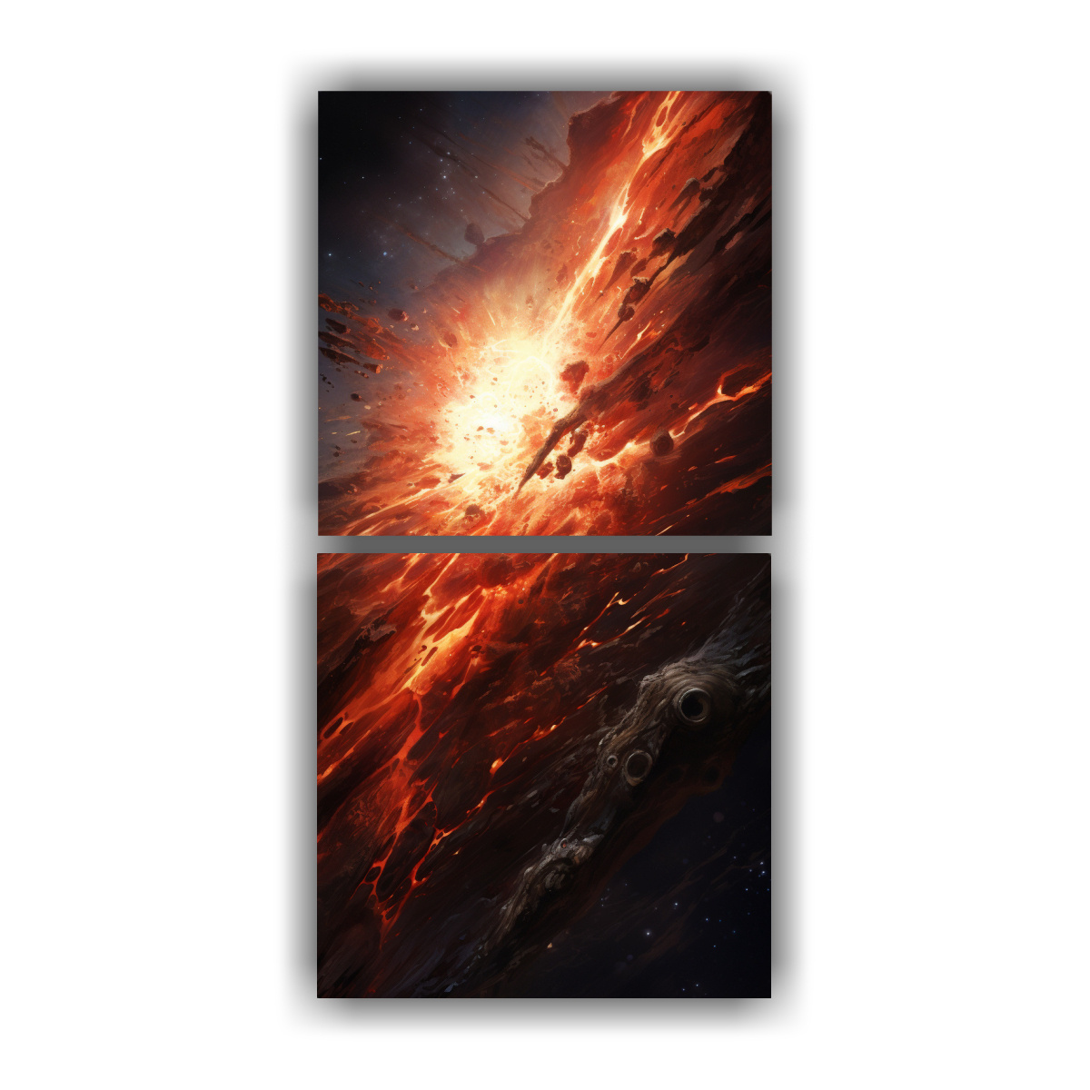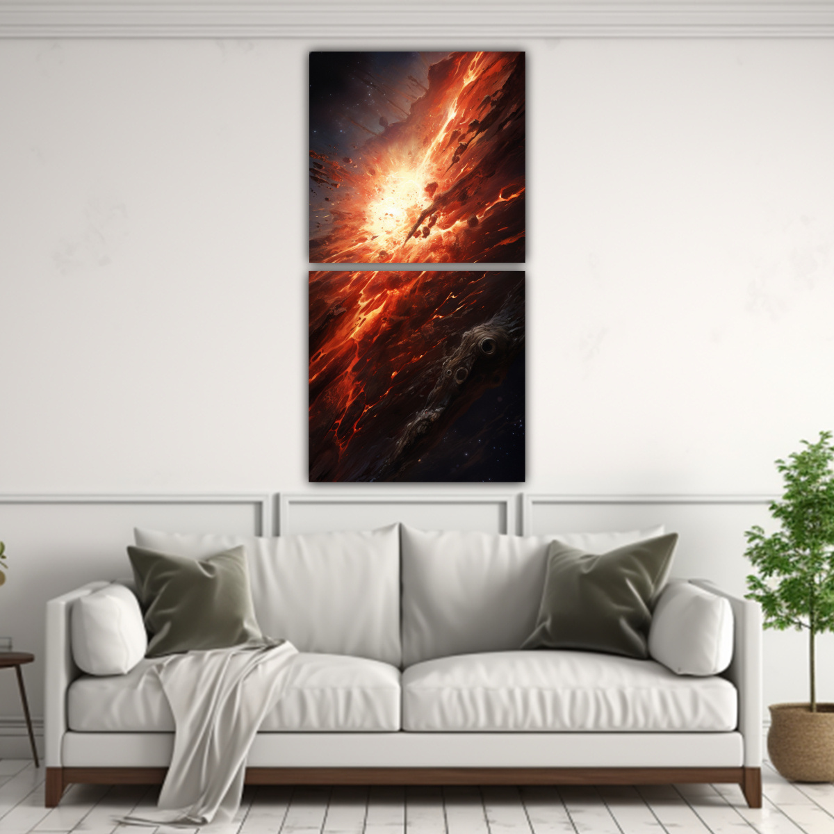 Coloca el cuadro Impacto cósmico de una meteorito con abstracción en tu sala de estar para crear un ambiente sofisticado y moderno Combínalo con muebles en tonos neutros como gris o beige, y agrega algunos detalles decorativos en tonos dorados para resaltar los colores de la obra de arte ¡Será el centro de atención de tu espacio!