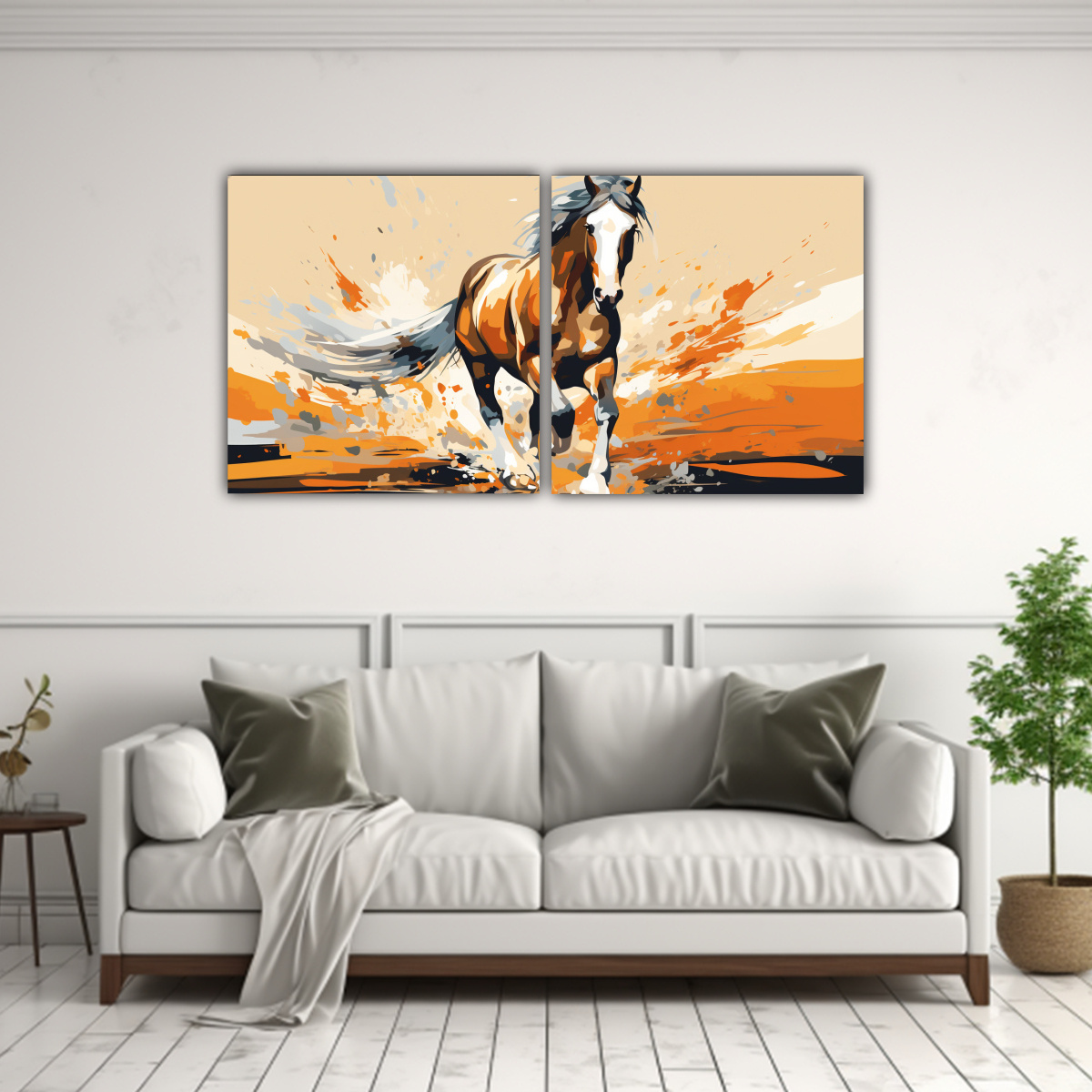 Coloca este Cuadro Floral Caballo en Blanco y Naranja en tu sala de estar para crear un punto focal impactante Combínalo con muebles en tonos neutros como blancos y grises para resaltar su vibrante paleta de colores y añadir un toque de modernidad a tu espacio