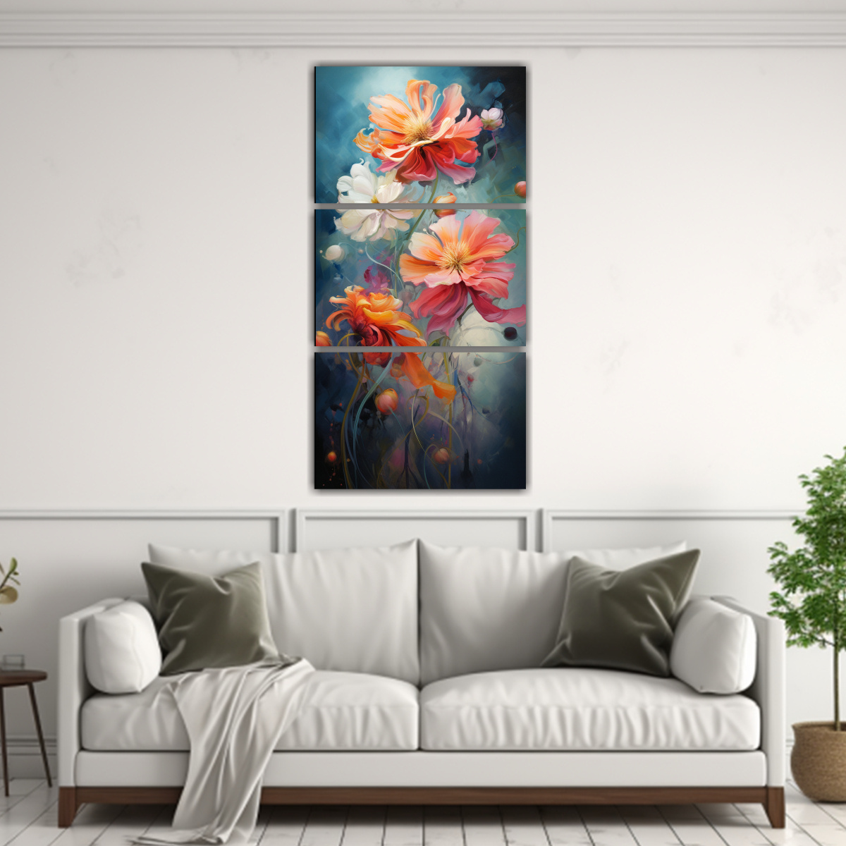 Para realzar la belleza de tus espacios, coloca este Cuadro de flores abstractas en perspectivas únicas en tu sala de estar sobre un mueble blanco para crear un impacto visual Combínalo con cojines en tonos turquesa y coral para lograr una decoración armoniosa y elegante