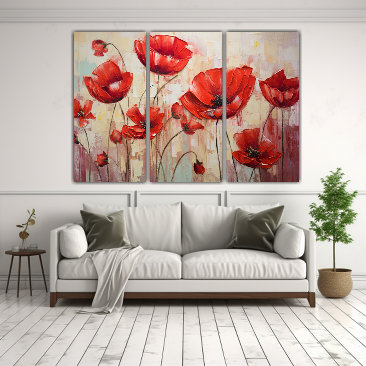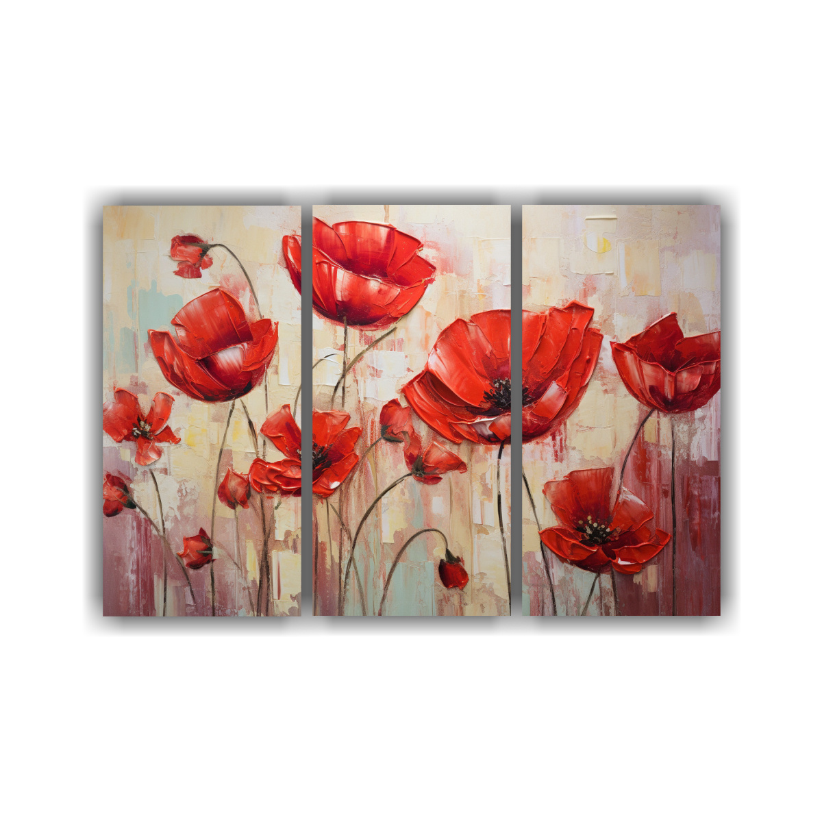 Coloca este cuadro de Cuadros Flores Rojas Estilo Galería en lienzo en tu sala de estar sobre un sofá de color neutro para resaltar su vibrante paleta de colores Complementa con cojines en tonos grisáceos y plateados para crear un ambiente armonioso y sofisticado