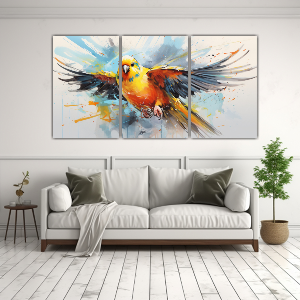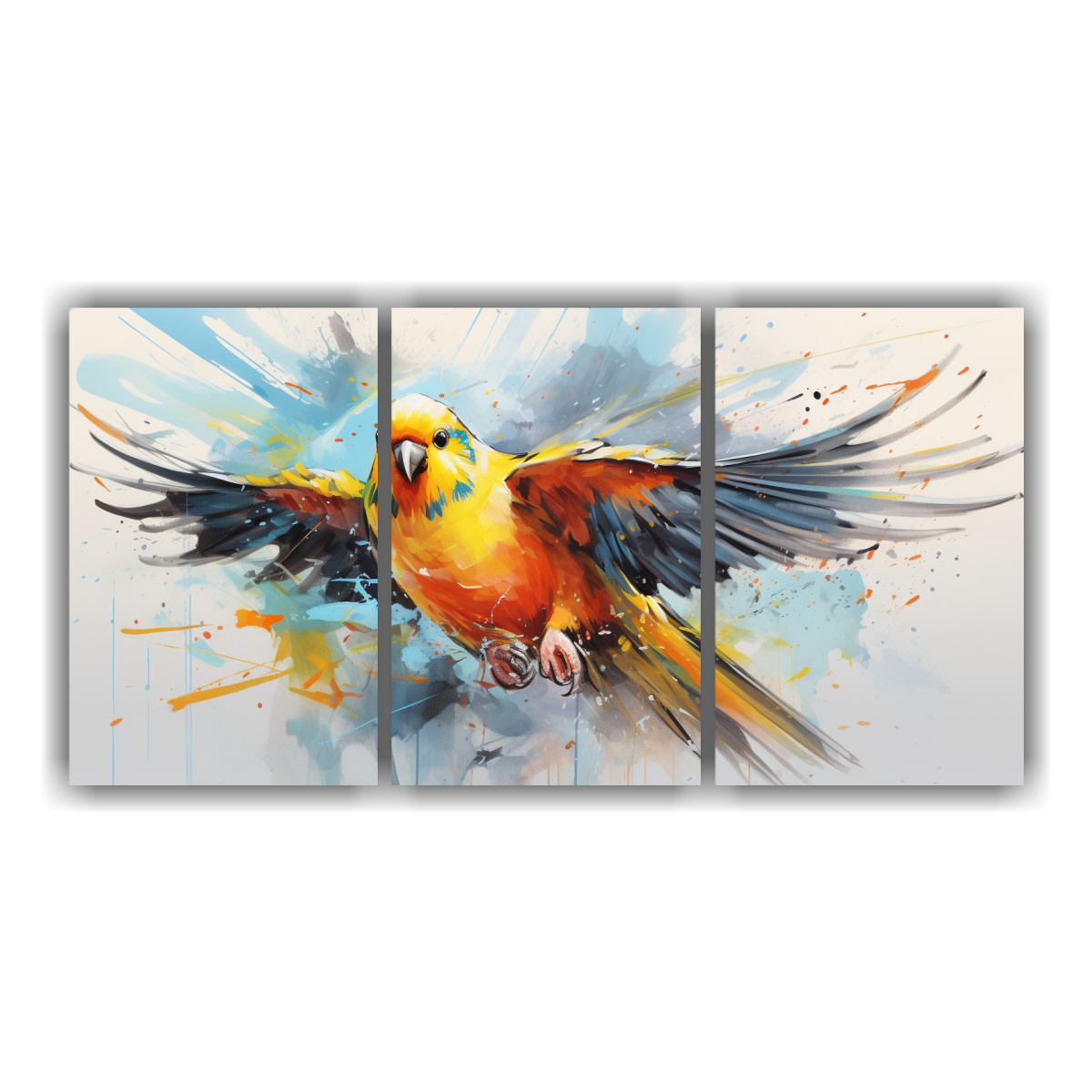 Este cuadro Budgerigar en colores amarillo y naranja en arte pop neo lucirá espectacular en tu sala de estar sobre un mueble de madera clara, combinado con cojines en tonos neutros y cortinas en colores cálidos ¡Crea un ambiente acogedor y moderno con esta pieza central!