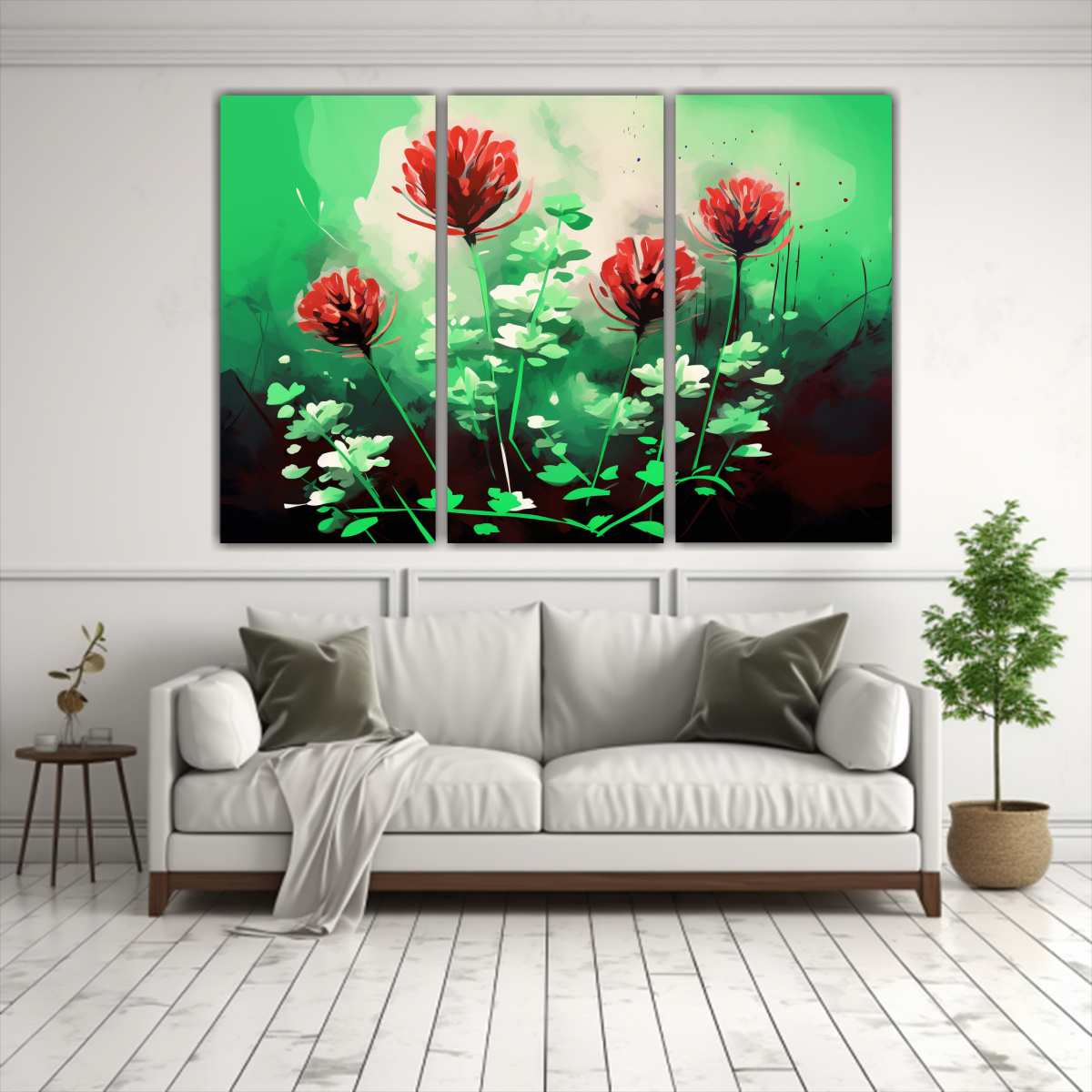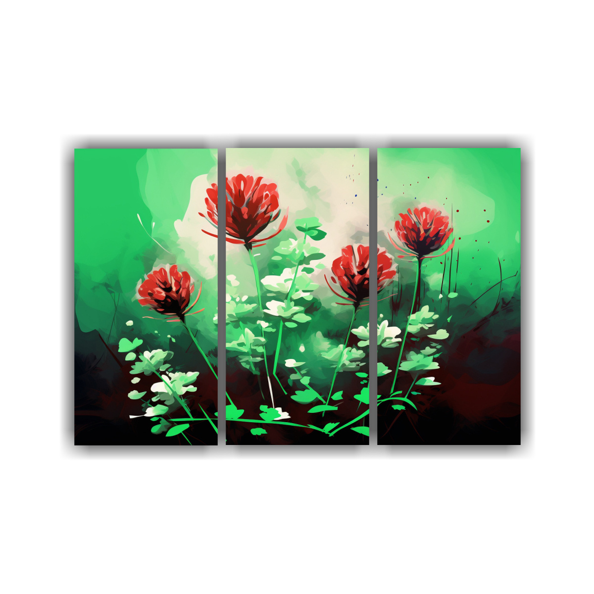 Renueva tu decoración con el set de 3 cuadros horizontales de hierbas tréboles en tonos verde y rojo neo-noir Calidad garantizada con precios accesibles en DecoCuadros